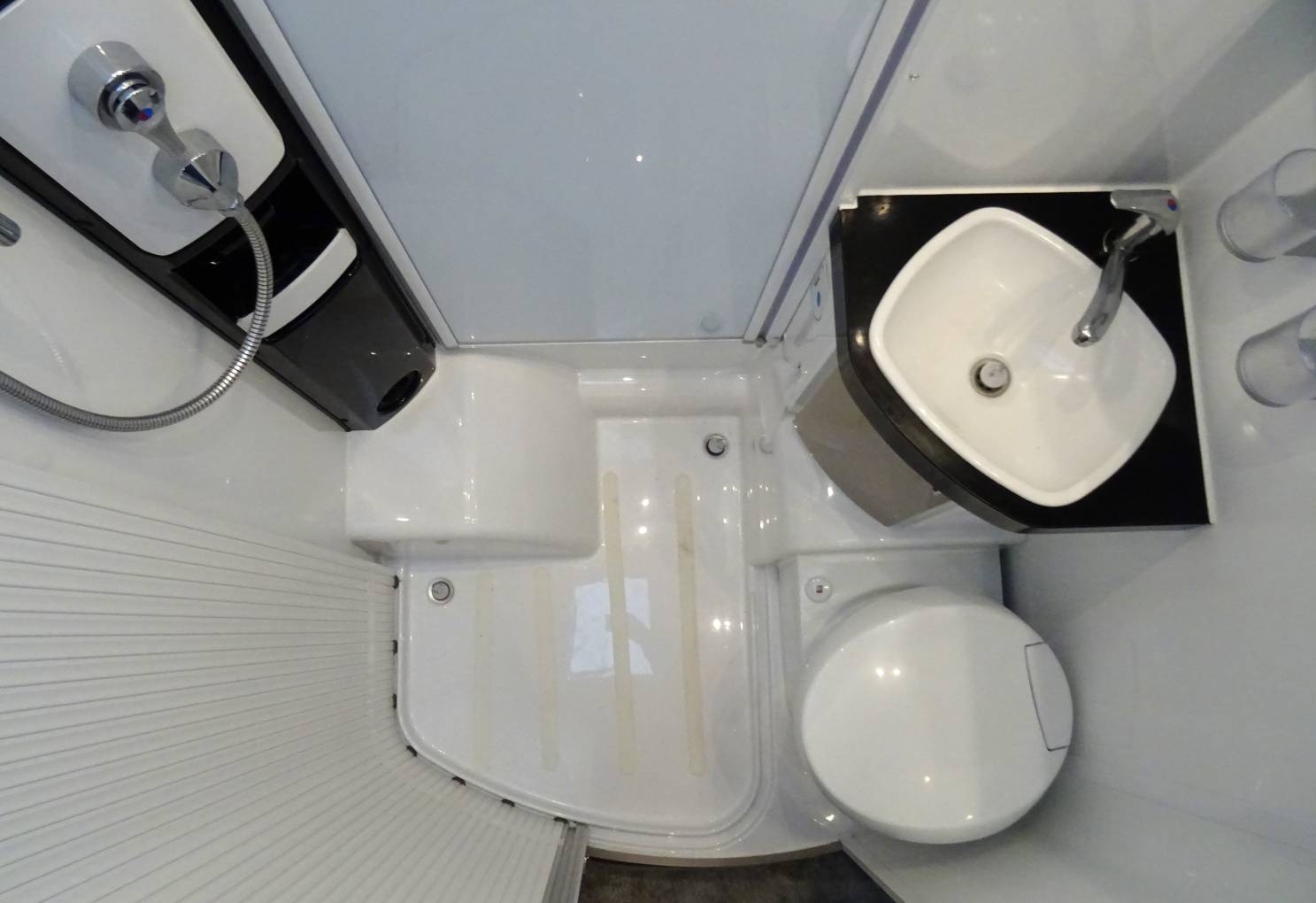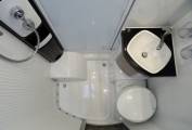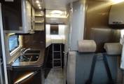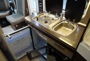 The central kitchen area enjoys a fridge freezer, 3 gas burner stove with an oven below which is integrated into the worktop space. In the centre of the motorhome there is an immaculate, good sized washroom which features a shower, toilet and sink with storage cabinets above.