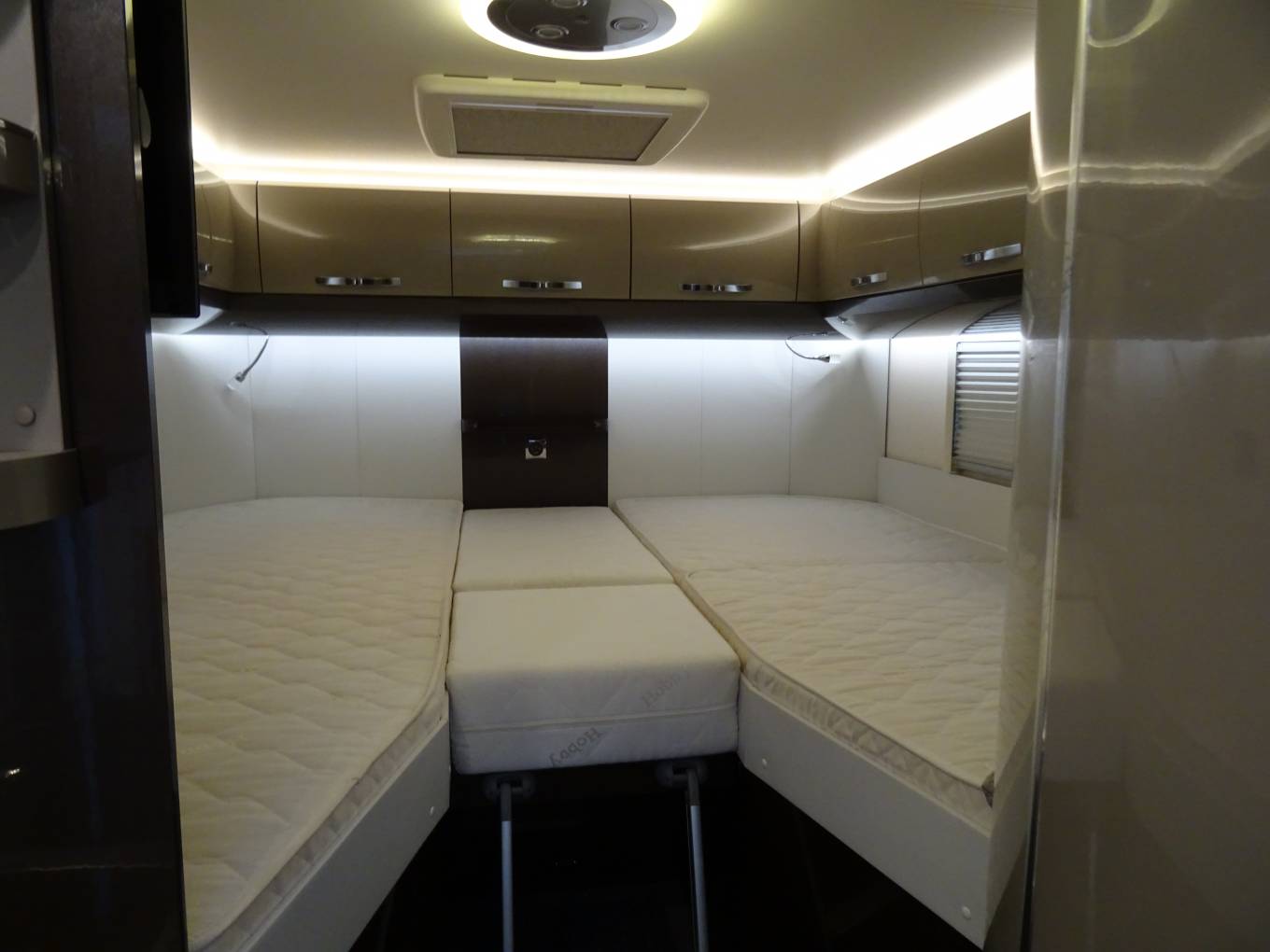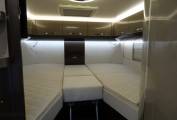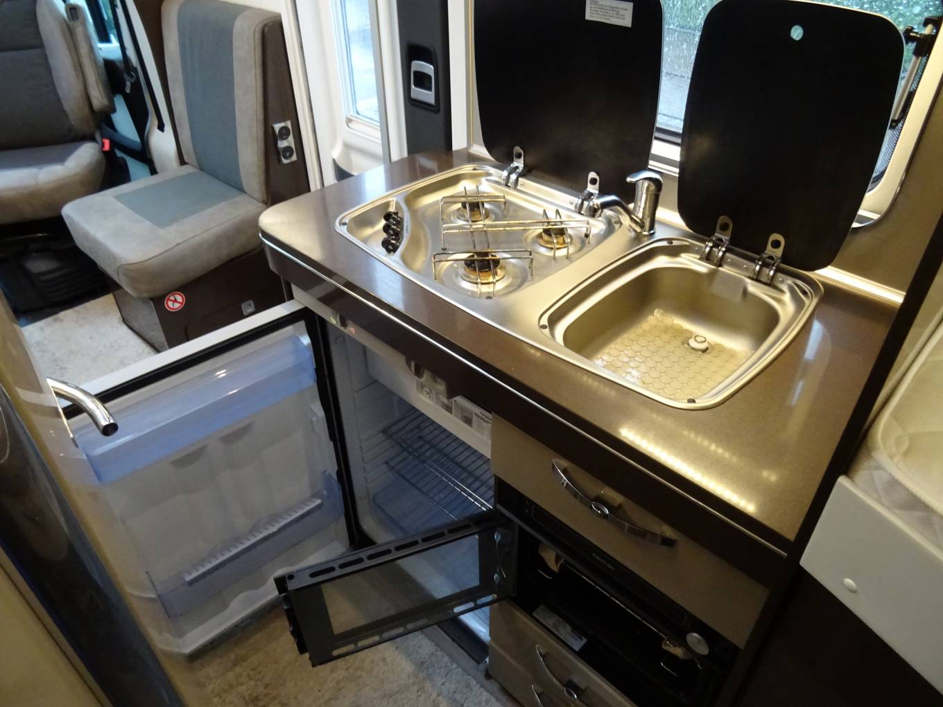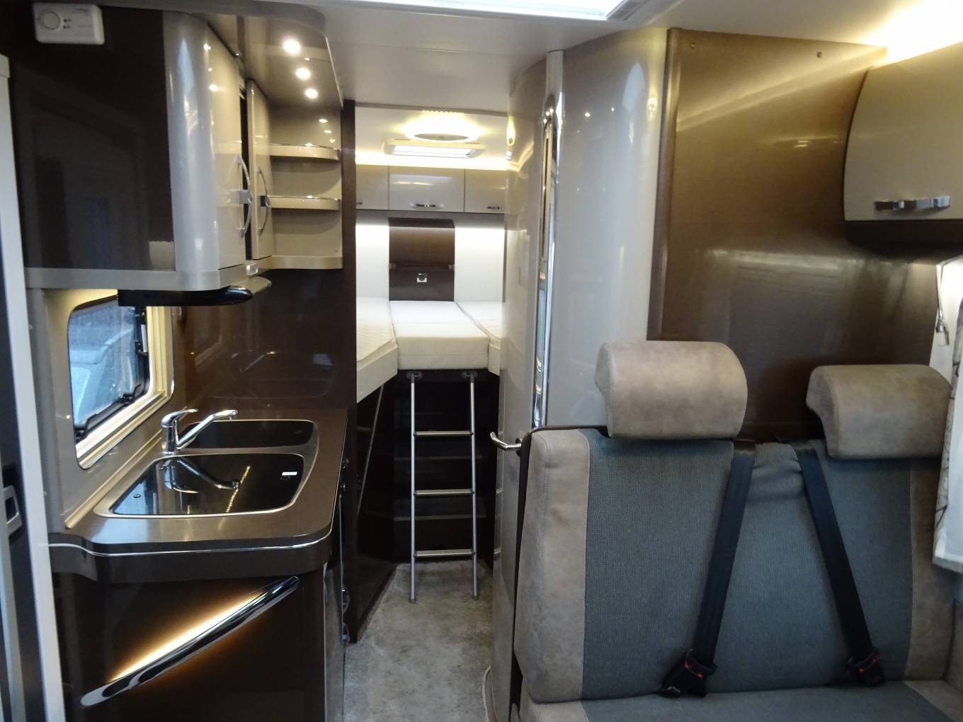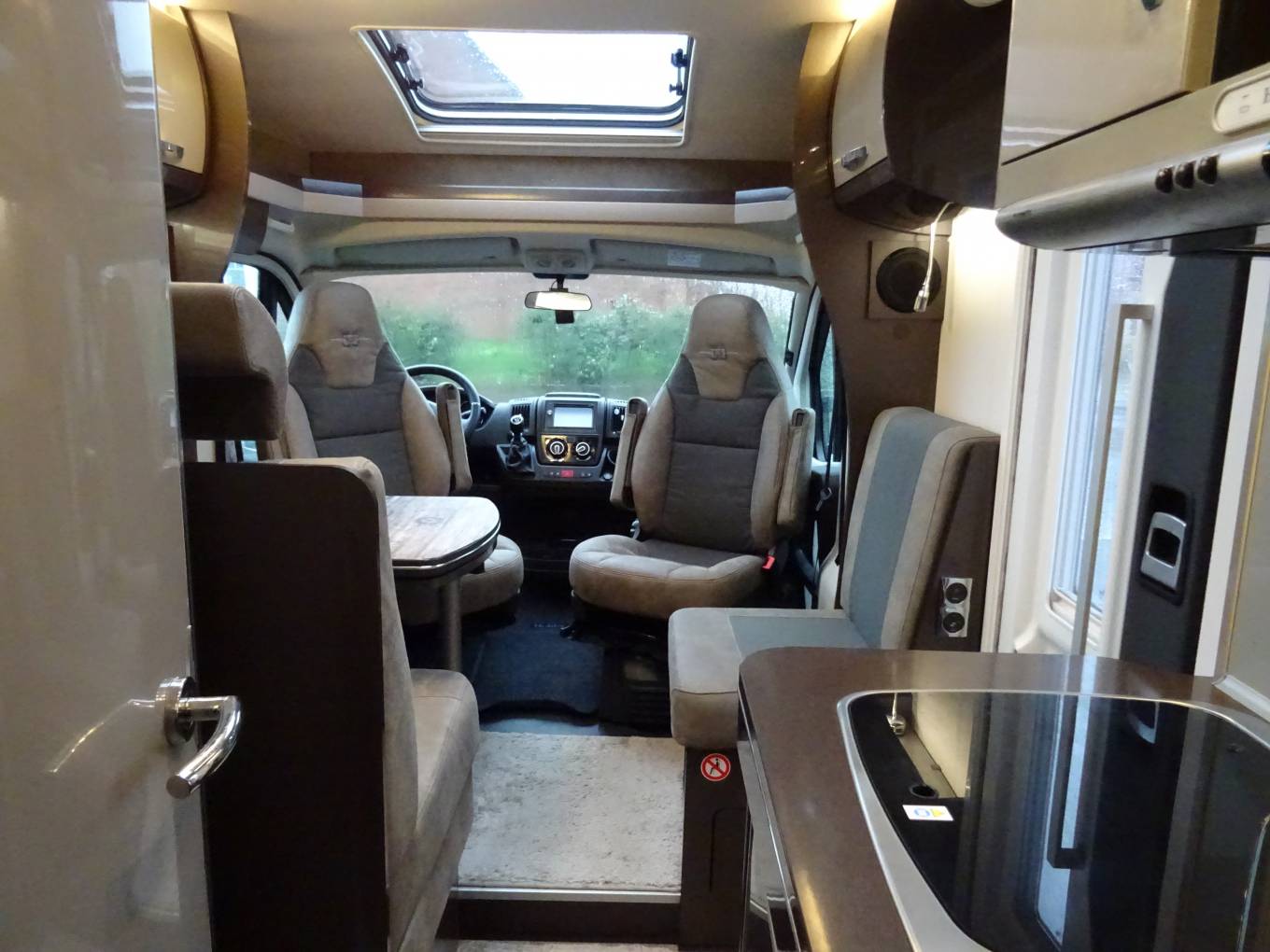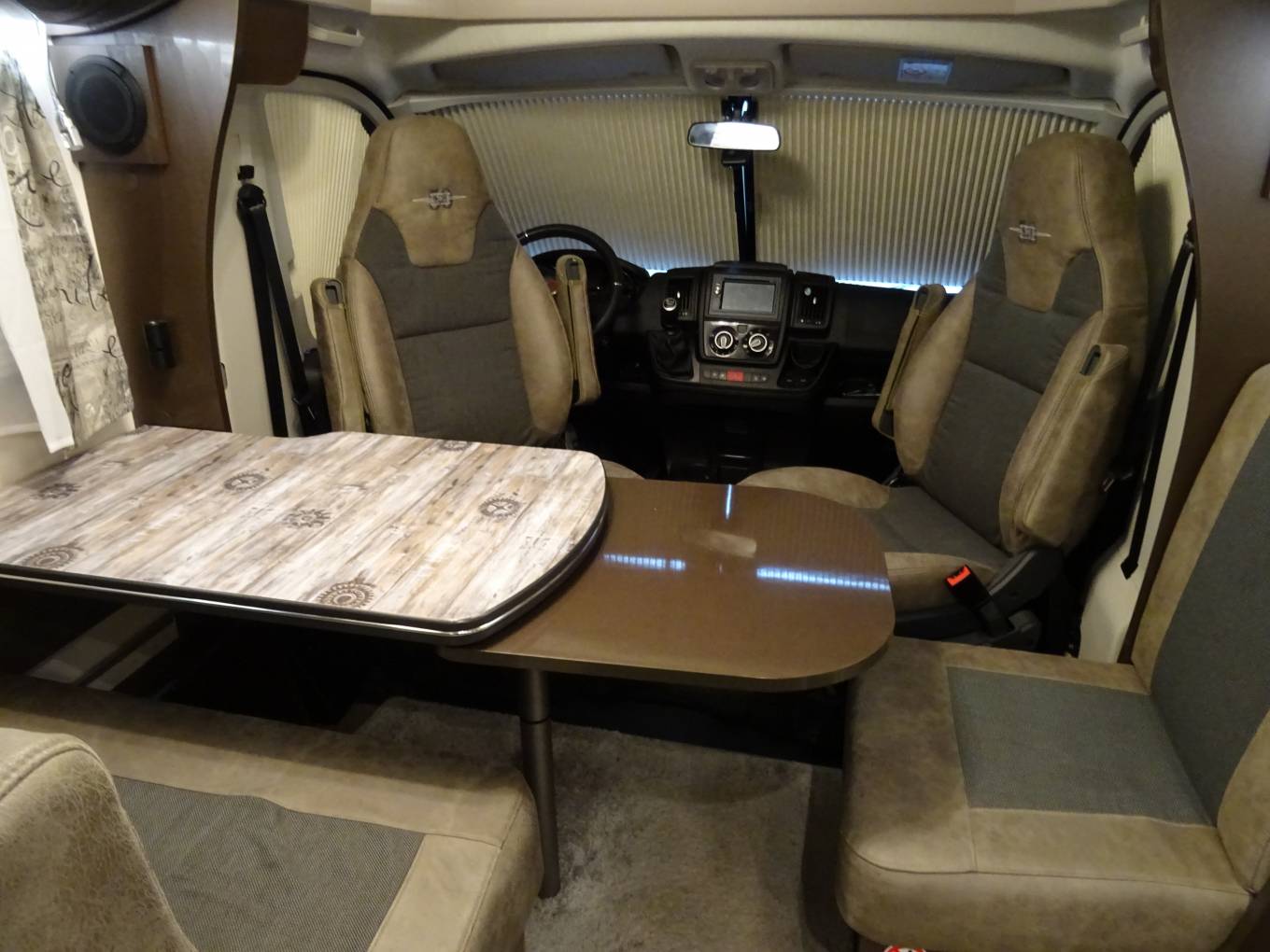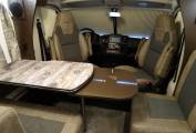Internally it has rear fixed beds which can be used as two single beds or can be converted into a large double bed. There are two swivelling front captain seats that help create a front dining area with the other seats being a double seat (with 2 seatbelts) and a single side seat all of which surround a removable table, creating a great area to dine and relax in. This area can also be converted into a single sleeping area if needed.