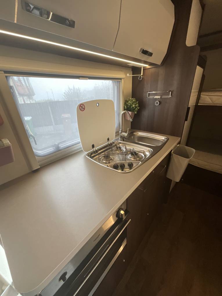 The central lounge area provides a comfortable dining space for up to 6 people. The kitchen has a Thetford oven and grill, hob with 3 gas rings, a sink and a large capacity fridge freezer that operates on gas or electricity.