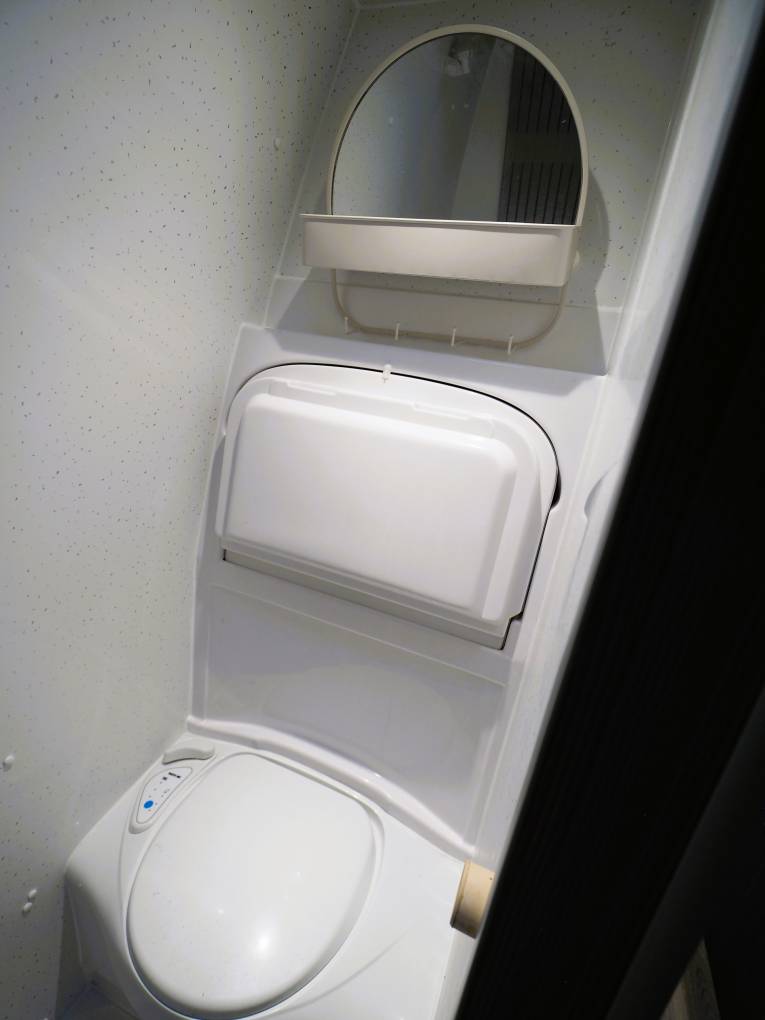 Opposite the kitchen, separated by a sliding tambour door is a fully equipped washroom with flushing cassette toilet, pull down sink and shower. Real home from home comforts.