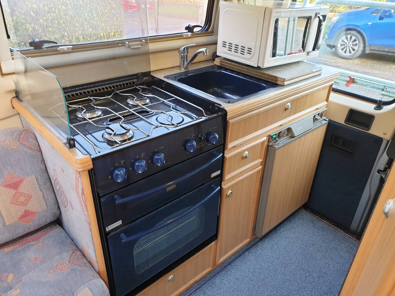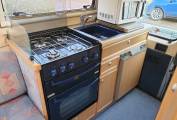 is a rear kitchen which includes a 3-way fridge, oven, grill, 3 gas hob,