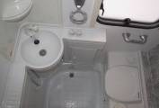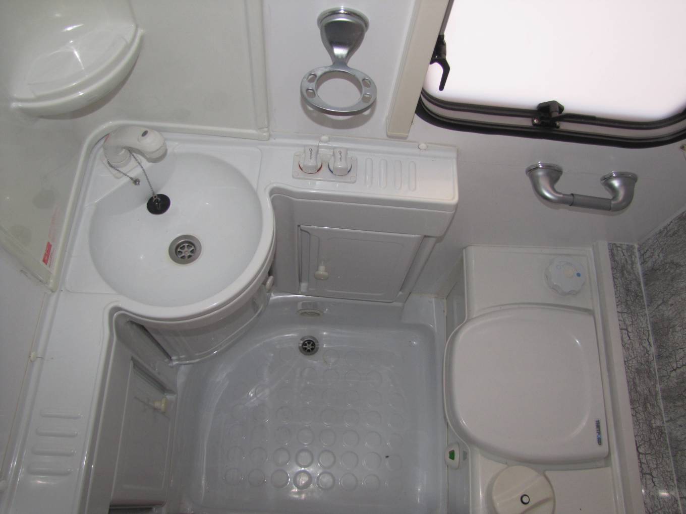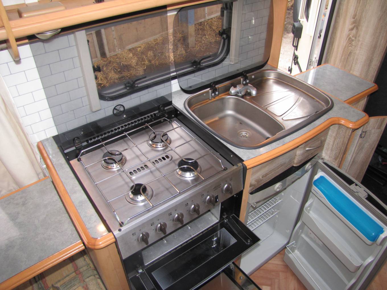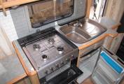 Moving along the vehicle you have the fully equipped kitchen with Fridge with small freezer compartment, 4 gas ring hob, separate oven and grill, sink with drainer and plenty of storage above and below.