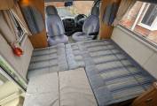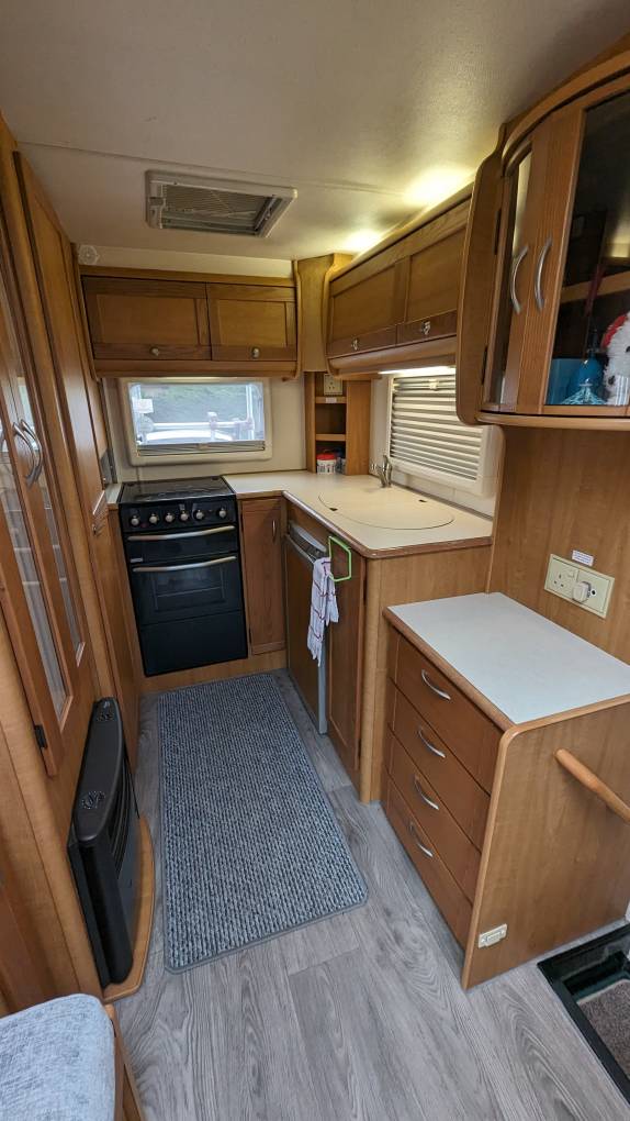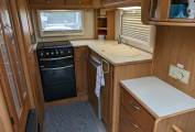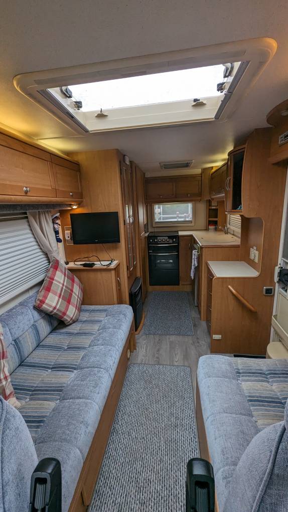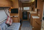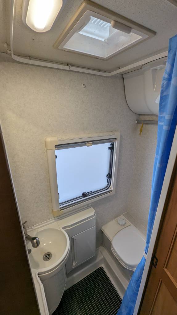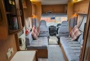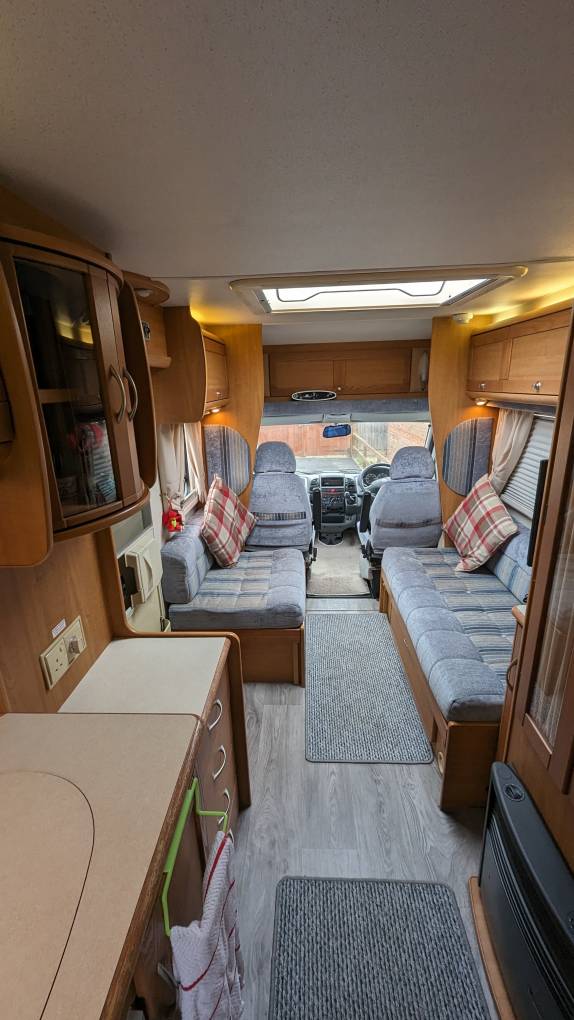 Venturing towards the rear, encounter a fully equipped kitchen boasting a full-size oven with 3 gas and 1 electric ring, grill, a 3-way fridge, and a sink unit with both hot and cold running water. Abundant internal storage, including a wardrobe, caters to your organisational needs. Stay warm with Truma heating system. Natural light from the generously sized roof light at the front bathes the interior in natural light, creating a pleasant atmosphere for relaxation during the day.