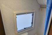 At the front, ample storage above the cab provides convenience, complemented by two captain's chairs forming a dinette with two side benches. Behind the driver's seat, discover a three-seater side bench, facing a double seat side bench that effortlessly transforms into a double bed for a restful night. The well-appointed washroom includes a cassette toilet, a stylish vanity washbasin, and a combined shower cubicle.