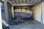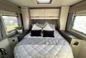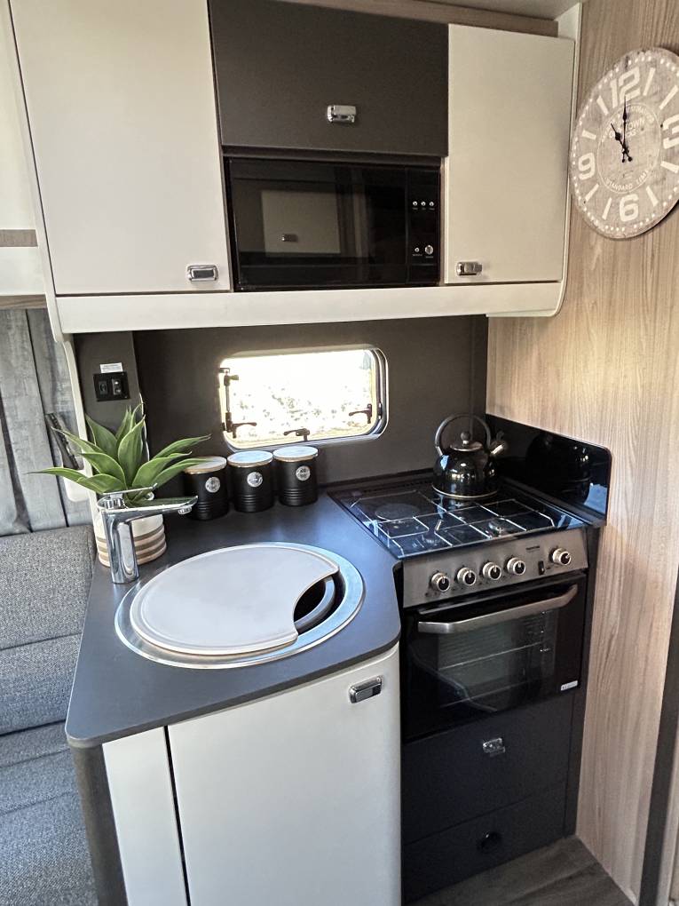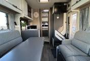 The kitchen is impressively equipped and features a Thetford oven and grill, a dual-fuel hob with an electric hotplate and 3 gas burners, a microwave and a 133 litre Dometic dual hinged fridge freezer with automatic selection.