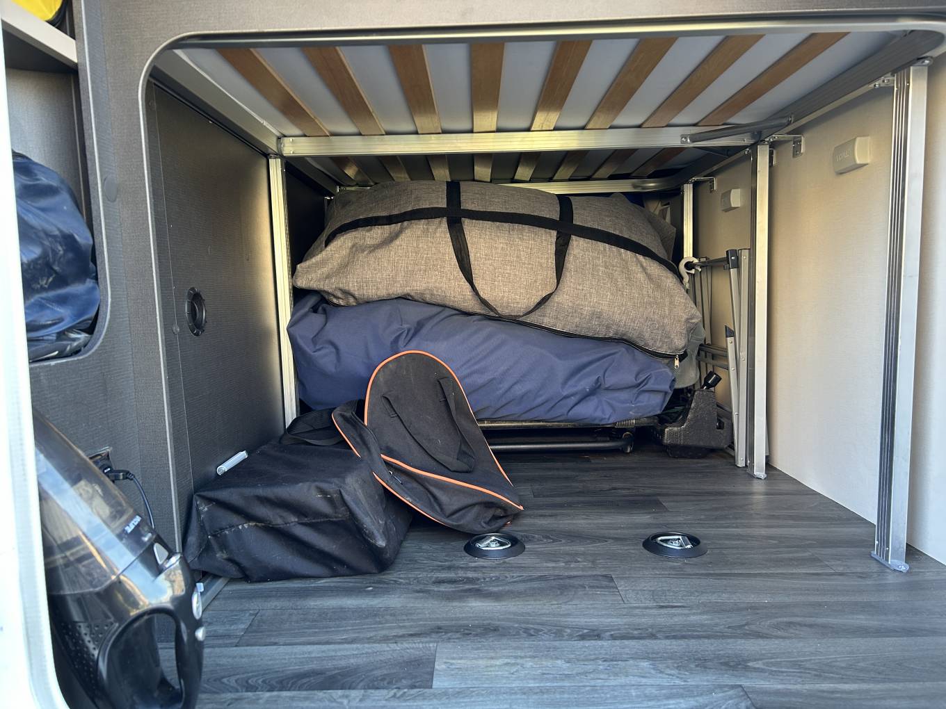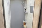 The bathroom features a superb Ecocamel Jetstorm power shower that uses less water. On the other side of the motorhome is a Thetford cassette toilet, a wash basin with a mixer tap, a large mirror to help make sure you look gorgeous for the day ahead and 2 bathroom storage cupboards. There are sliding doors between the bedroom and also the lounge so the bathroom can de divided off.
