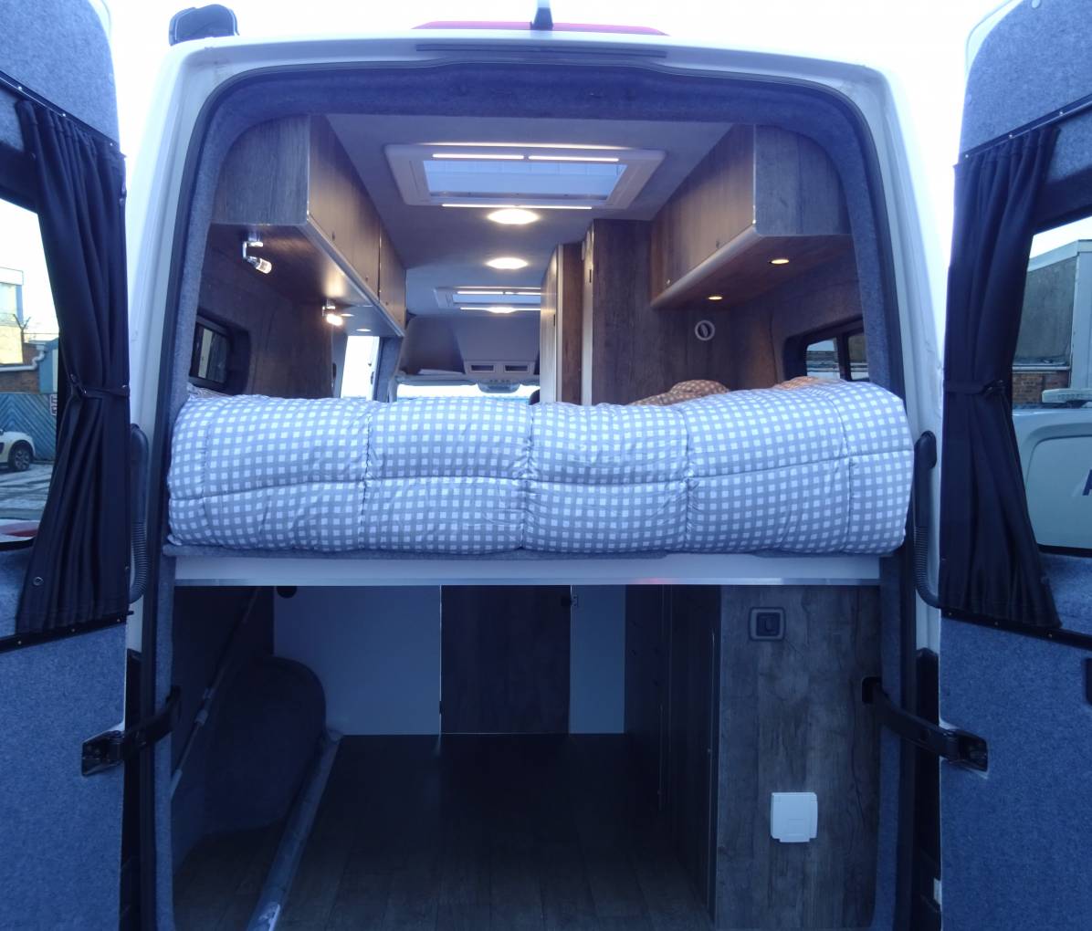 This impeccable camper features a rear double bed which spans the full width of the van and sits above a garage storage area.