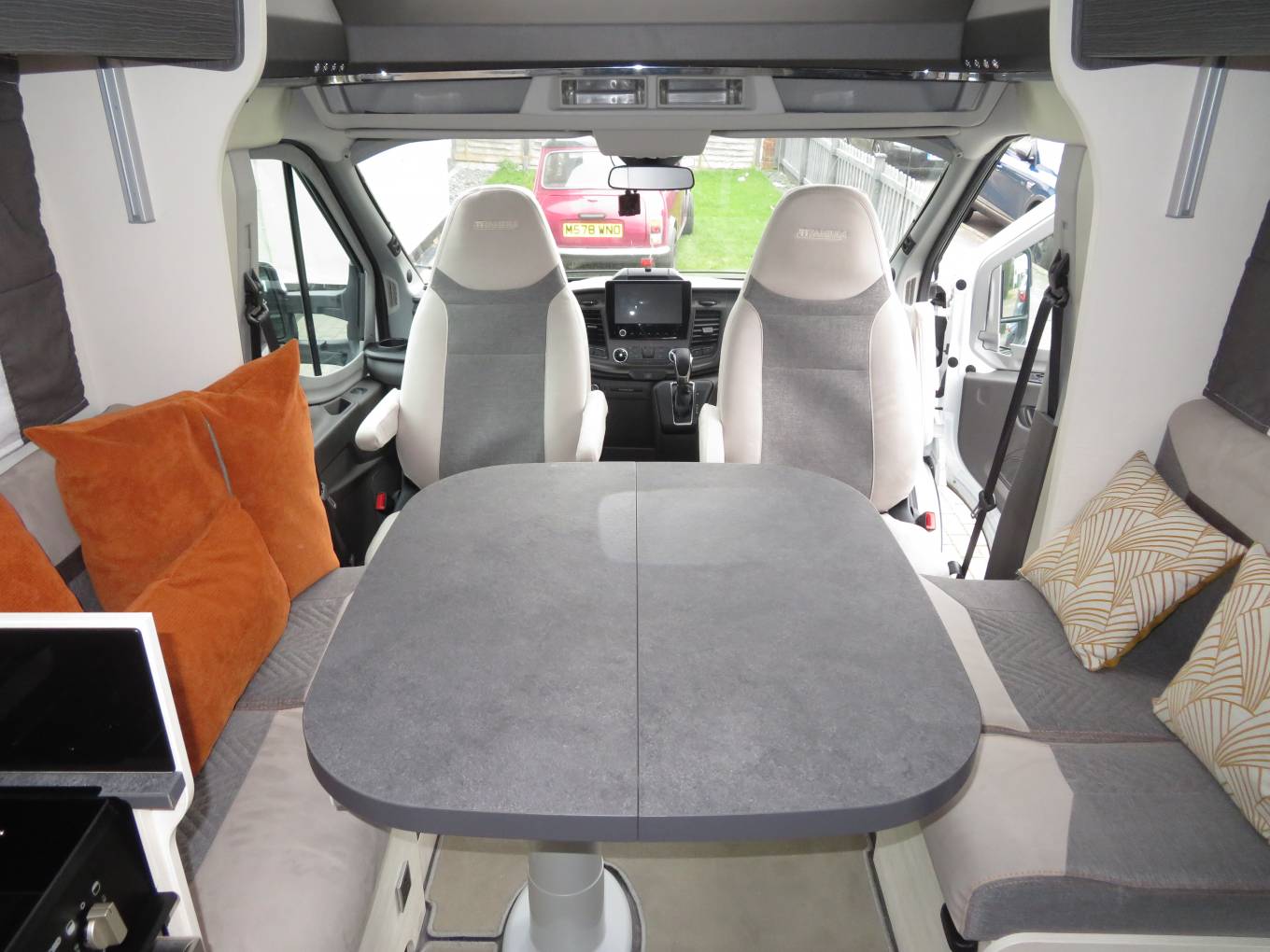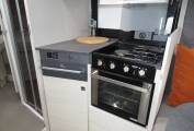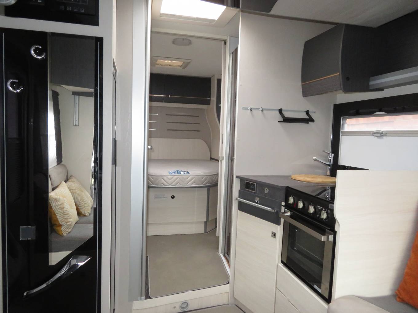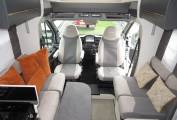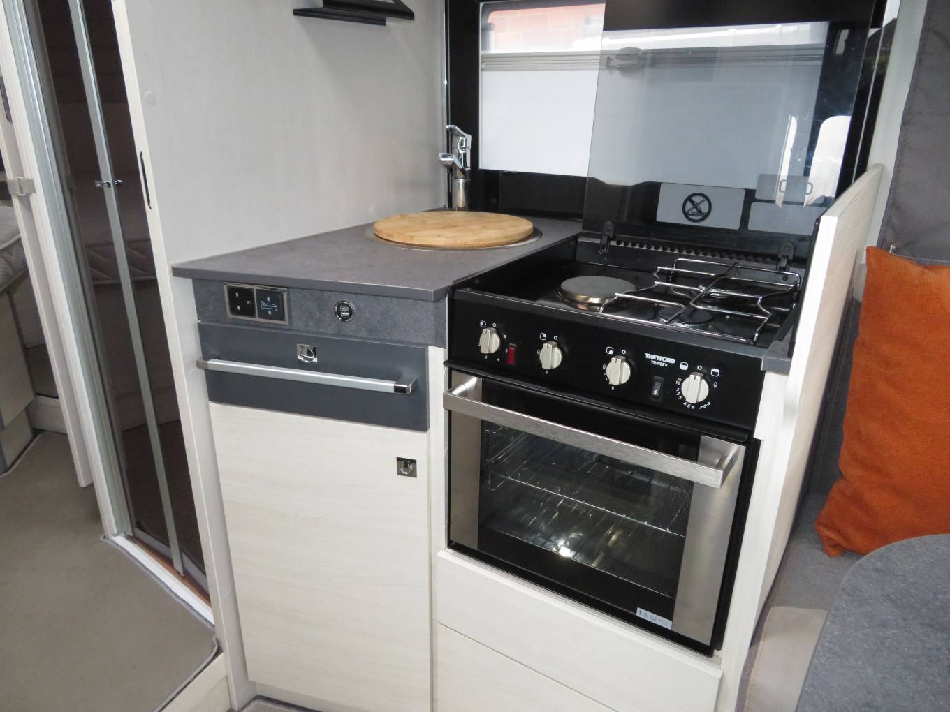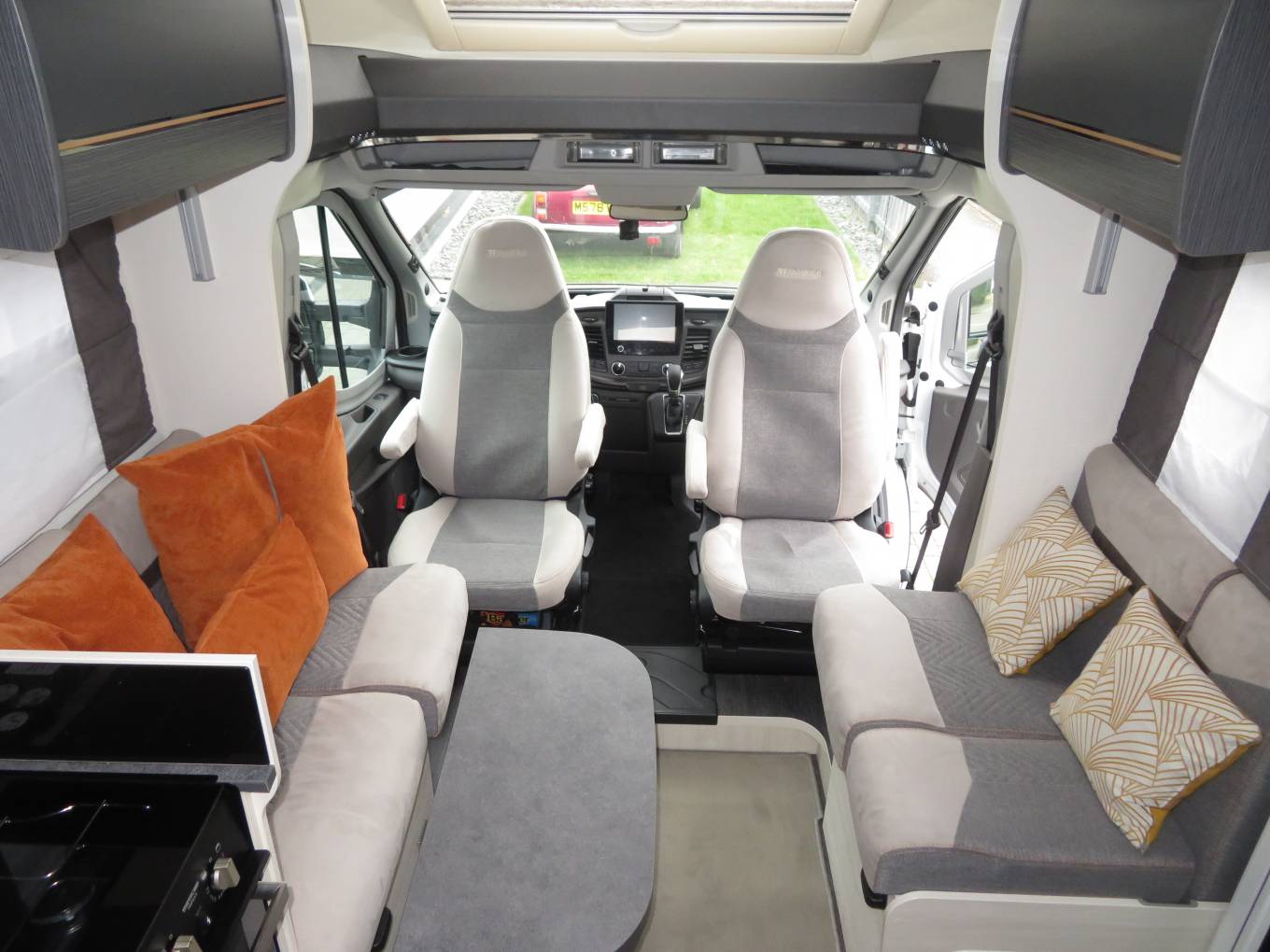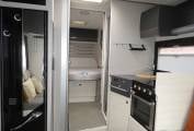 The layout inside the motorhome is excellent and makes the most of the space available. At the front you have an extremely spacious lounge area with two side facing sofas and the two captain's chairs. In the centre there is a multi-directional table that can be raised or dropped to the perfect height. This gives you an ideal space to relax or to sit down and enjoy a meal or snack. The side sofas also contain two travelling seats that fold away when not in use, ideal if you want to take a couple of guests out for the day. Moving back, the 788 has a well-equipped kitchen that features a Thetford Triplex oven and grill and a dual-fuel hob with an electric hotplate and 2 gas burners. There is also a large fridge freezer in this motorhome so plenty of room for food and drinks.