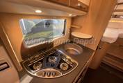 Moving rear is the galley kitchen which consists of; 3 burner gas hob; round stainless steel sink with chrome mixer tap. Above and below there is plenty of cupboard & drawer space for all holiday provisions and an oven & grill below the counter. The sink lid also doubles as a chopping board and shelf. To the right of the kitchen is a large Dometic Fridge with separate freezer compartment. This can be powered by 240v,12v, or gas depending whether you are plugged in on site or wild camping.