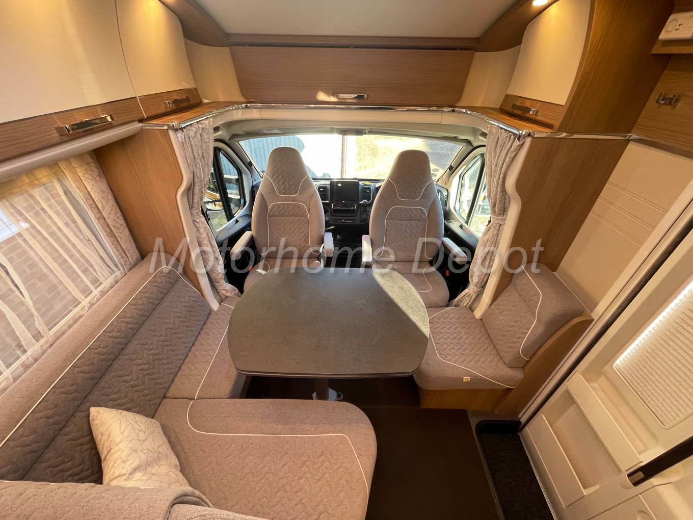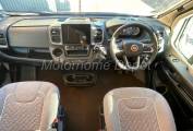 From one of Germany’s finest motorhome builders Carthago the Malibu brand, which represents great build quality at an affordable price. This T 430 LE model is bright and airy throughout with a modern feel. Based on the ever popular Fiat Ducato chassis with the 2.2 litre multijet turbo diesel engine with add blue, with the latest 9 speed ZF automatic gear box. It also benefits from the 140 PS engine upgrade rated as Euro 6 AR. The chassis has been specified to 3500kg GVW which means it can be driven by anyone with a full UK licence. The vehicle has had 1 owner from new & covered only 4935 miles, it is still covered by a Fiat Warranty until 24 months & Carthago warranty for the same period . The cab benefits from: Digital dashboard; air conditioning; cruise control; multi function steering wheel; central locking front; multi media floating screen head unit with Bluetooth phone and music streaming, navigation & reverse camera screen; electric adjustable & heated mirrors; electric windows front; remis blinds to front & side screens; there is also a curtain to close off at night.