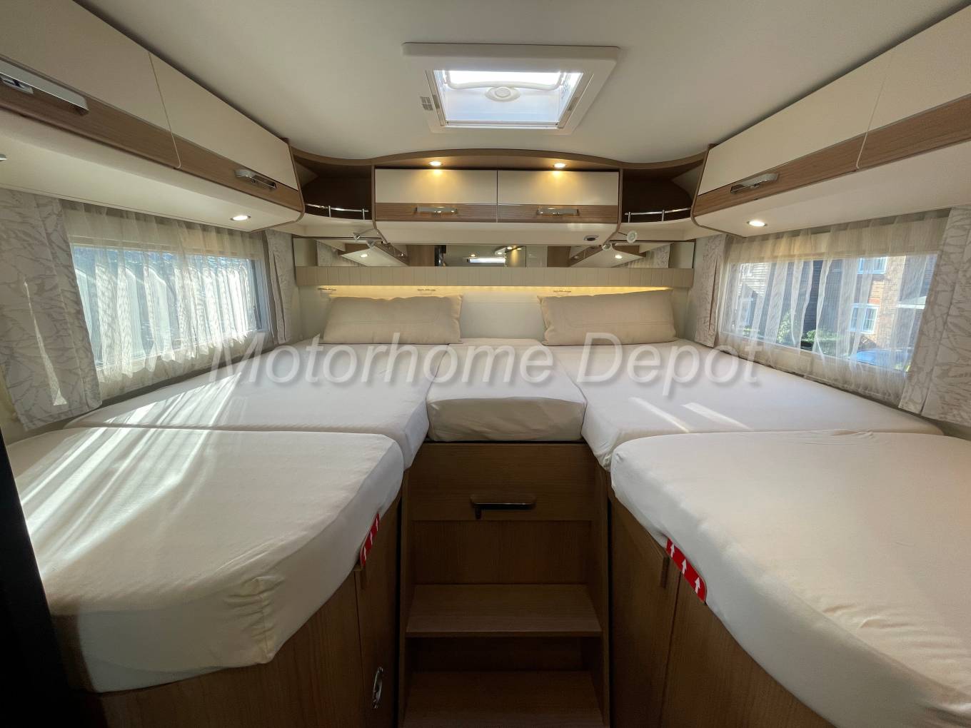 Finally to the rear is the large bedroom which is a twin singles layout over large garage. It benefits from being able to extend the area into a large double bed with the addition of and infill cushion and the ladder moving forward. The foot of the beds lift up to reveal hanging wardrobes and storage space. The head of the beds can be inclined for reading.