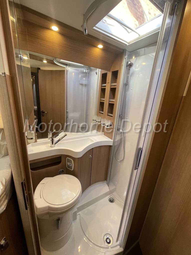 Opposite is the large all in one bathroom which benefits from having a separate shower area that can be sealed off with round Perspex doors, keeping the toilet area dry whilst in use. The door main can be opened across the gangway giving a large private area for dressing. The toilette a Thetford cassette style unit with swivel head and fresh water flush. Above the toilet is a white built in sink with chrome mixer tap.