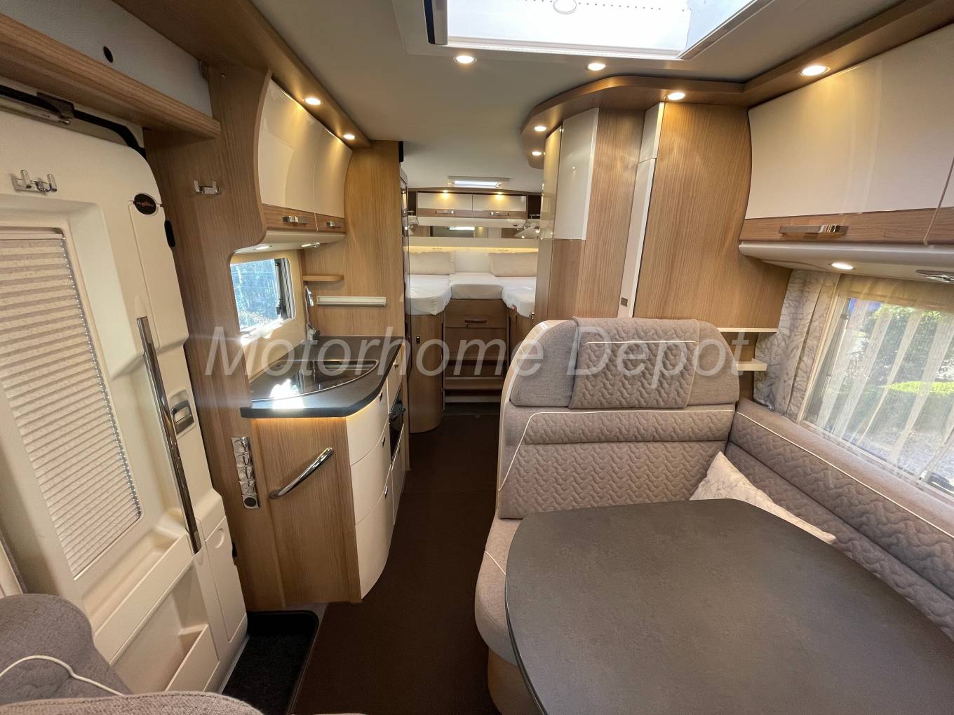 We enter the motorhome on the driver side immediately to the right of the habitation door a single side seat and opposite the dinette with central table and L shaped sofa. The forward facing part of the sofa benefits from 2 traveling seats with 3 point belts. The front two seats also rotate to join this area so you could easily seat 6 people around the table if entertaining on site. There is a large flatscreen TV that slides out from behind the dinette area for your evening viewing.