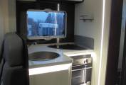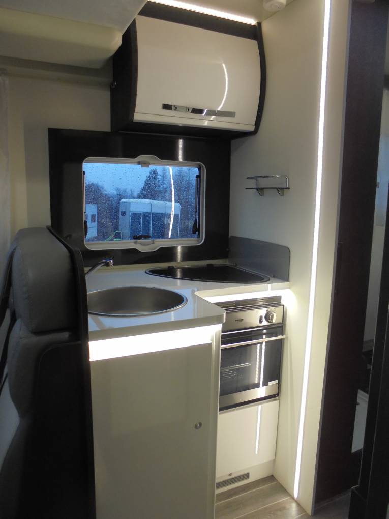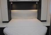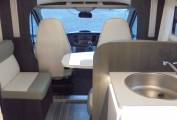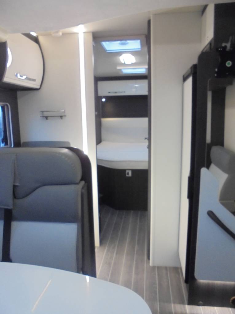 double drop down bed above the dinette. Rollerteam's Zefiro range is it's upmarket and up standard range of motorhome's with this 696 model showing its sleek modern white high gloss interior design and its cream faux leather upholstery.