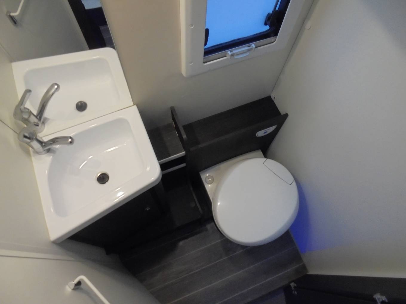 as the Thetford toilet, wash basin, storage space and large vanity mirror and across