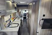 The kitchen is practical and fully equipped with a Dometic fridge freezer, 3 gas burner and 1 hotplate hob, gas oven, microwave, stainless sink, and generous storage both high and low.