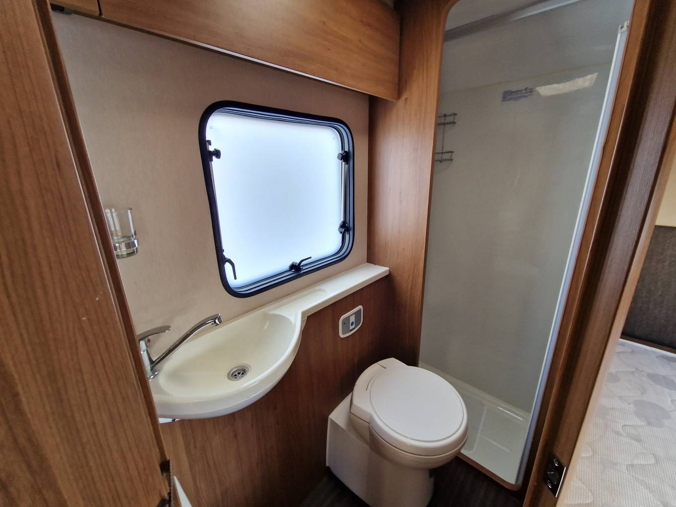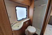 Adjacent to the bed you will find the very spacious washroom which consists of a separate shower cubicle, Thetford cassette toilet and hand washbasin.