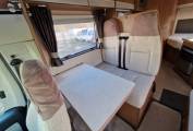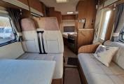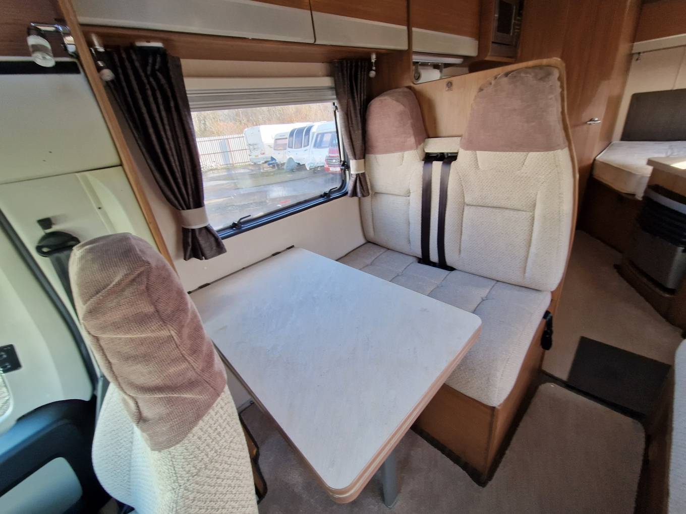 To the front of the motorhome is the lounge and dinette area with two front facing bench seats with belts and a sofa opposite, removable table and the 2 Captain seats. This area can be easily made up into a double bed in the evening. This area also boasts large storage space.