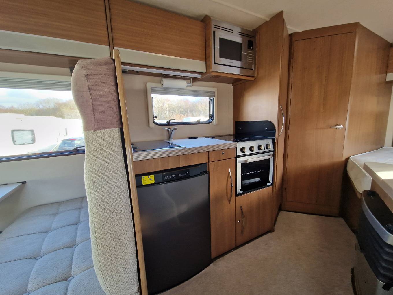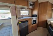 The well-equipped modern kitchen is located centrally and offers a rectangular sink with hot and cold mixer tap, three ring gas burner hob, combined oven & grill, 3-way fridge with integral freezer unit, microwave, pull-up stack with 3 mains sockets and a number of good-sized storage cabinets throughout the kitchen space.