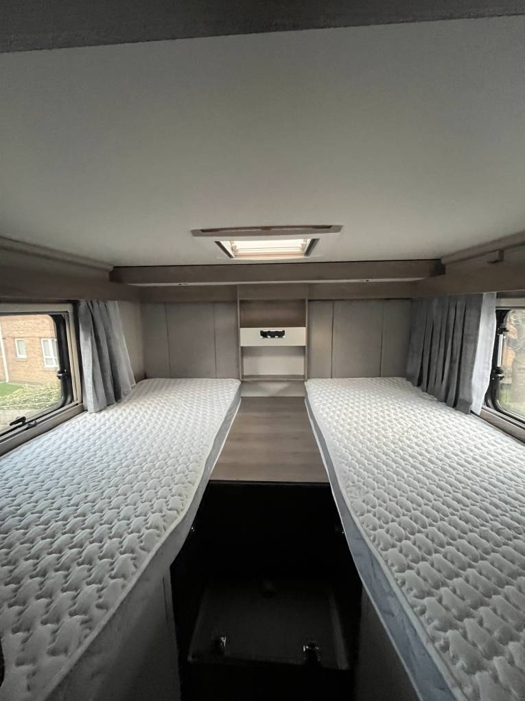 It also benefits from numerous fitted extras including an expensive Truma air-conditioning unit and a gas-flow system to name a couple, but it is the flexible layout that makes this motorhome so special, with a fixed rear double bed over a cavernous garage, fantastic washroom with separate shower, superb "L" shaped kitchen with all the facilities you need and finally, a front dinette with an electric height adjustable table that will allow 6 people to sit in comfort with the front seats swivelled.