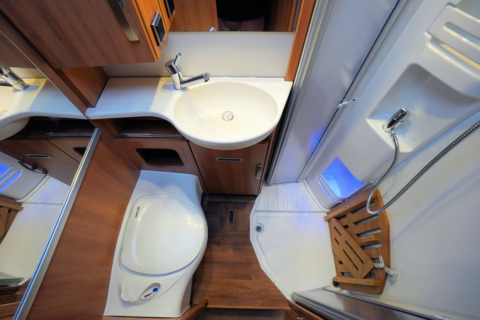• Washroom with Thetford cassette toilet with electric flush, hand basin