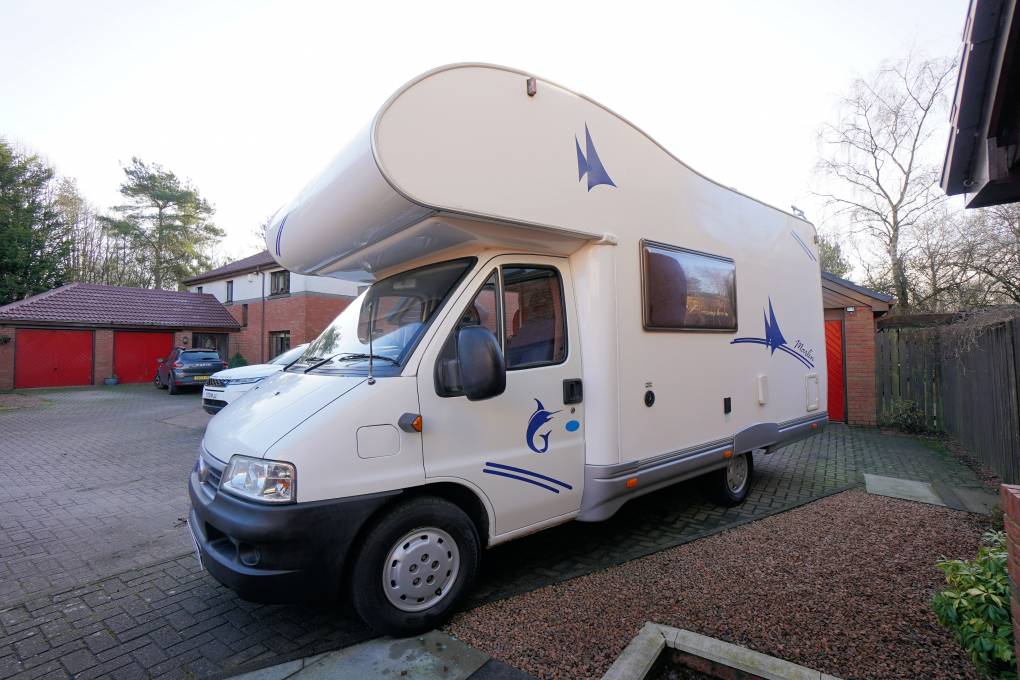 For sale we have a 2004 Elnagh Marlin 59, 5-berth, 6-seatbelts, over-cab double bed, end kitchen, motorhome.