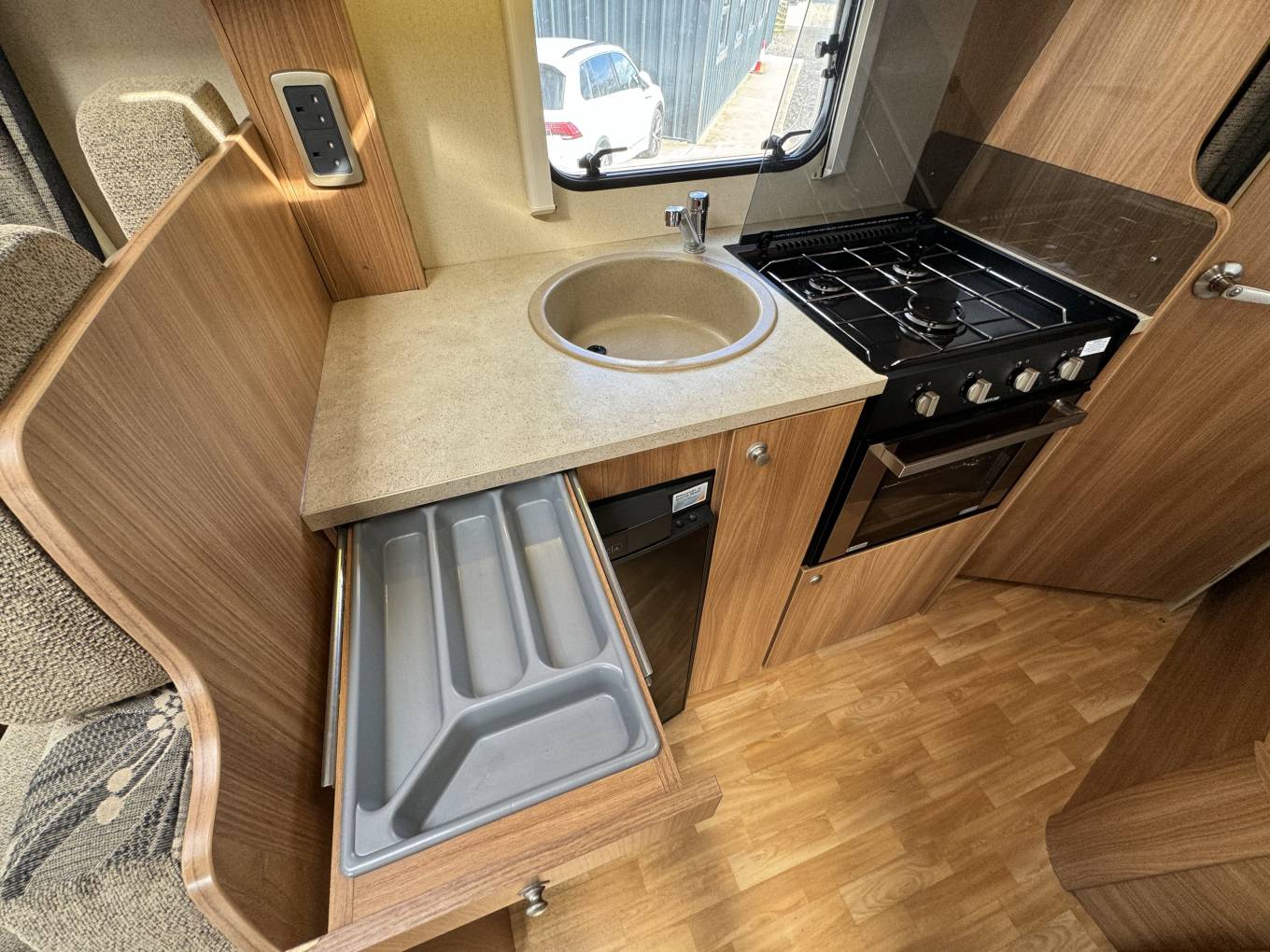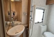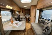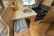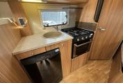 At the very rear of this motorhome you have a rear fixed bed which is a French bed layout. The bed has plenty of room and storage that can be accessed under the bed, the under bed storage can also be accessed from the outside as well as inside. Adjacent to the bed you have a wash room which houses a toilet and shower. There is also storage and a vanity mirror. Moving further forward through the motorhome you have a kitchen area that comes well equipped with a Large sink basin, Lots of worktop prep space, Fridge freezer, Oven and grill combi, 3x gas hobs and storage under cupboard and overhead.
