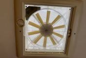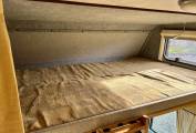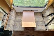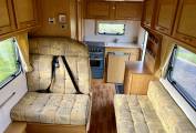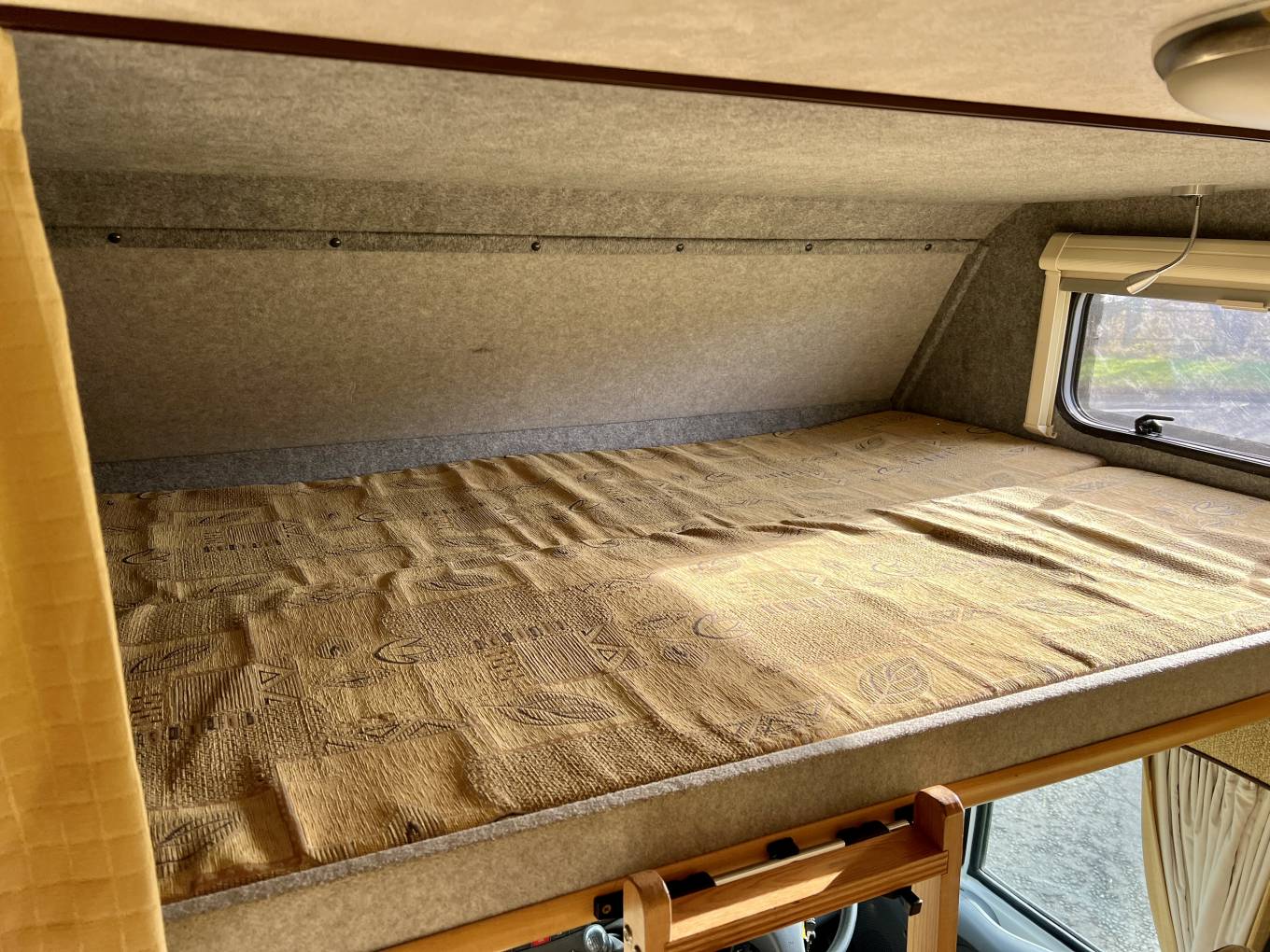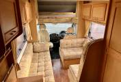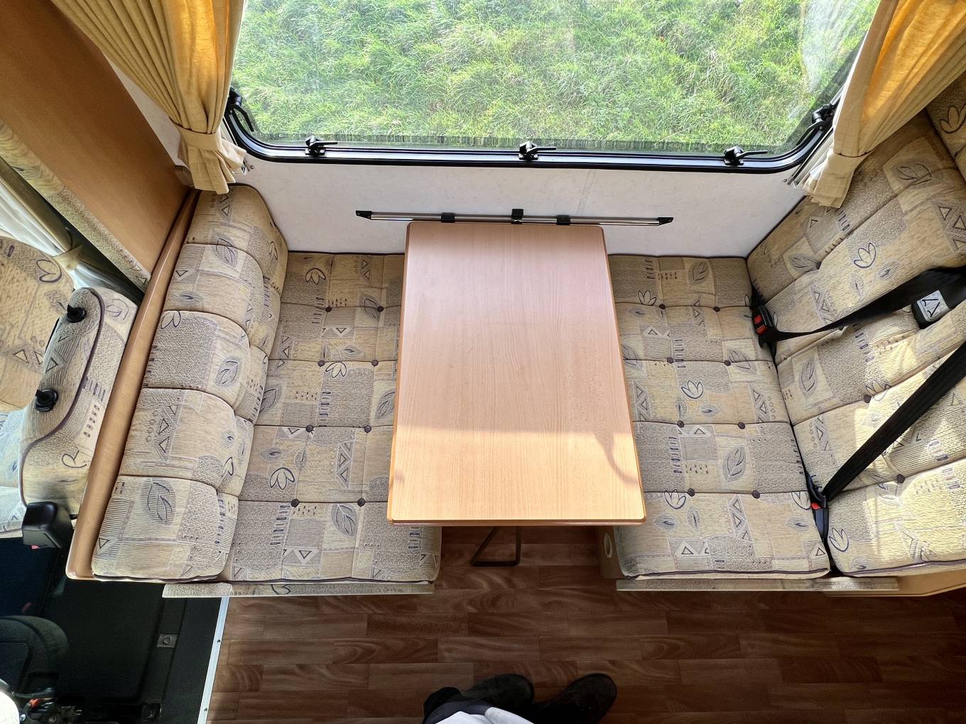 Midships you will find the large family wardrobe over the hot water storage and Truma blown air heating system opposite a dresser unit, while forward is the dinette which offers a side settee opposing two benches with a removable table, comfortably seating six or more for a social with the passenger seat swivelled. There are two additional forward facing seatbelts, making 4 in total. This area also makes up a double bed. Above the cab area is another double bed with a side window, also useful for storage of bulky items.