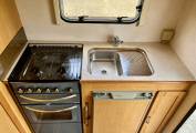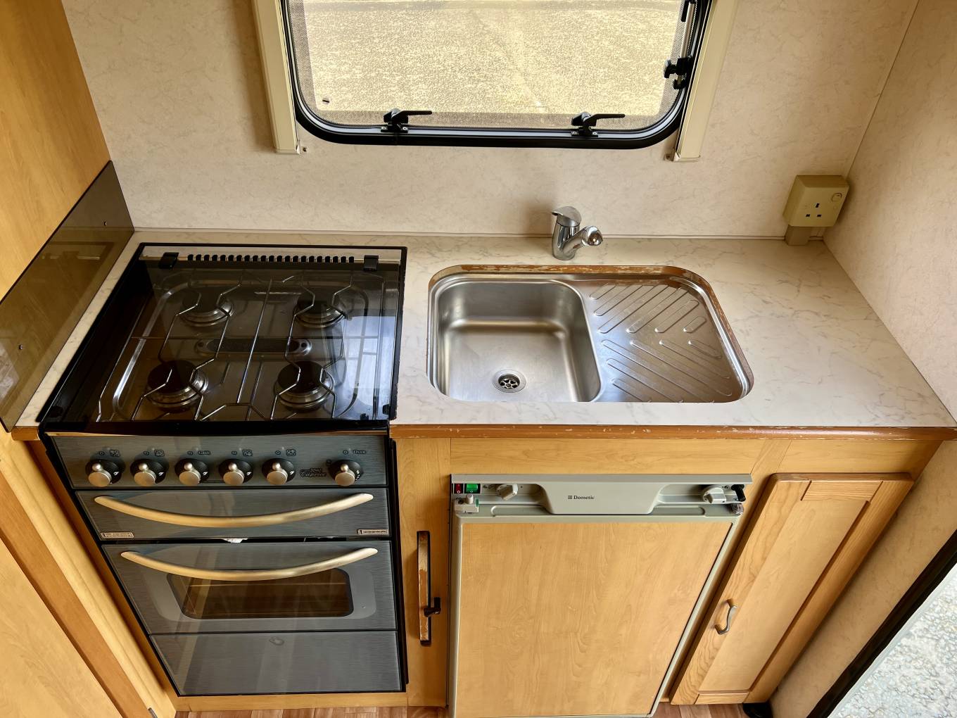 Entering the vehicle through the habitation door, you will find a well equipped kitchen across the rear which has a large 3 way fridge, 4 burner gas hob, grill and oven, and a good size sink. Adjacent to the kitchen, the washroom is neatly built into the rear corner and is spacious enough to include a vanity sink, shower and swivel toilet.