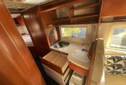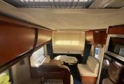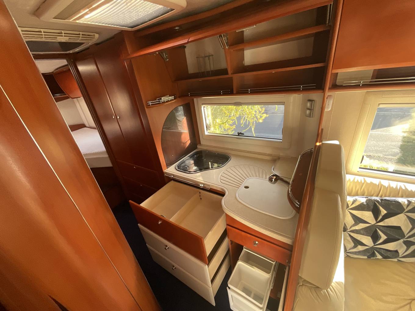 We enter the Motorhome on the Driver’s side immediately to the right is the Dinette which comprises of an L shaped sofa on the opposite side with 2 forward facing traveling seats with 3 point seat belts. On the Opposite side is a smaller sofa both upholstered in smooth sandstone leather. The table is height adjustable and can be moved to be central in the area so that you could easily seat 7 for dinner by rotating the front seats if entertaining on site. The front seats drop down to allow the double bed to swing down into place, this can be closed off with curtains. The 22” LED TV with electric drop down mechanism is situated under side cupboards on right.