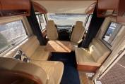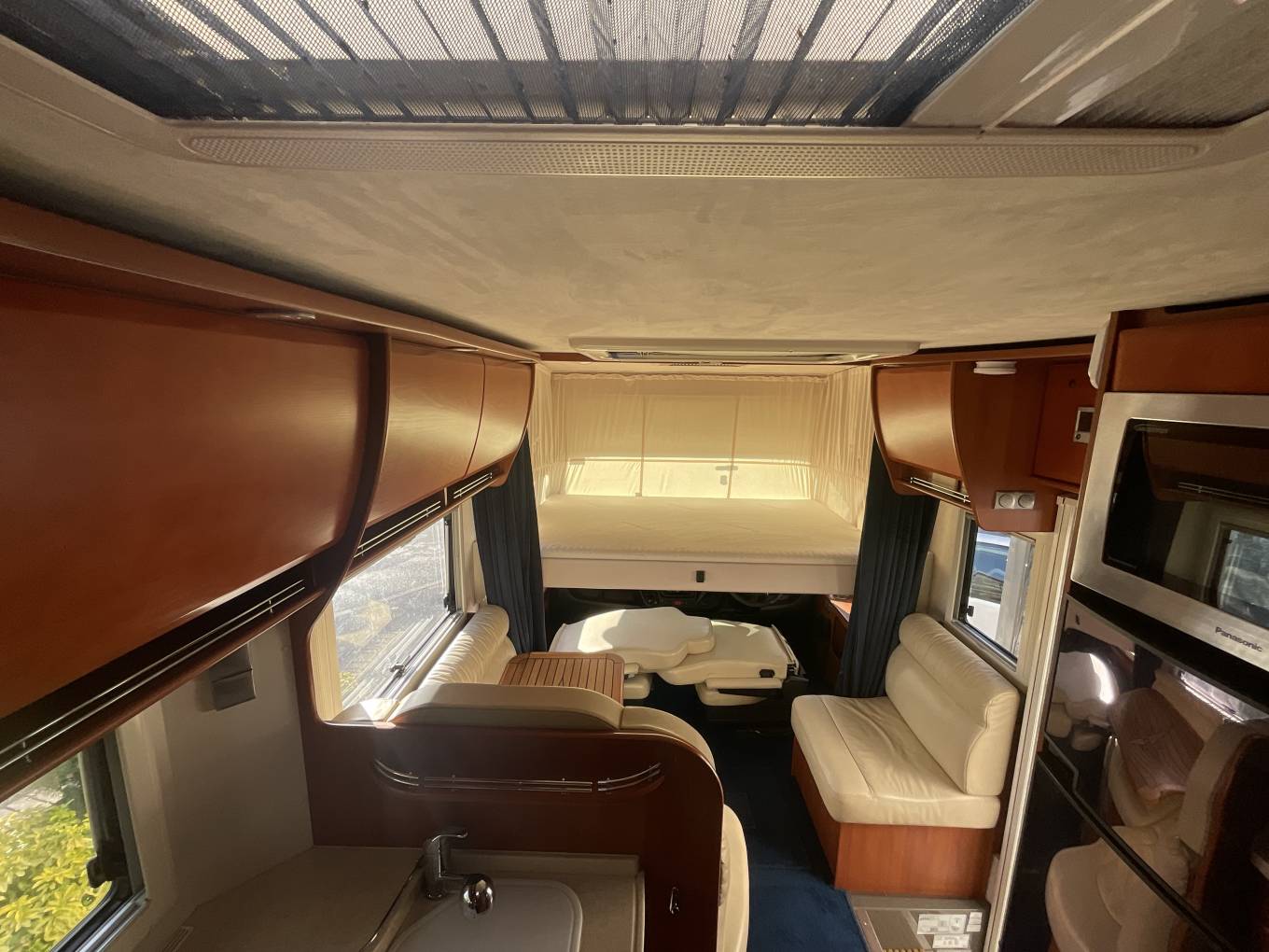 Credo package basic – Electric front roller blind. Credo starter package, 2 – Panoramic Heki roof lights in lounge, Electrical power package 2: 1 x 300aH AGM batteries, combination 100 A battery charger with mains pre-selection, sine wave inverter from 12v to 230v, 4000 W peak and 2000 watt continuous output with mains failure compensation; engine heat exchanger for living area.