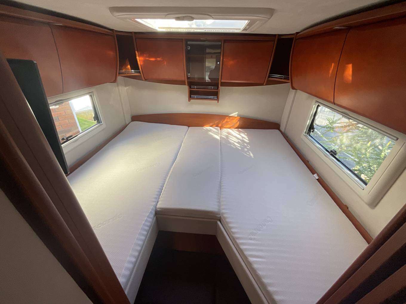 Main Bedroom; is a fixed twin single beds layout with infill cushion. Plenty of overhead cupboard space and Avtex TV to the foot of the driver’s side of the bed.
