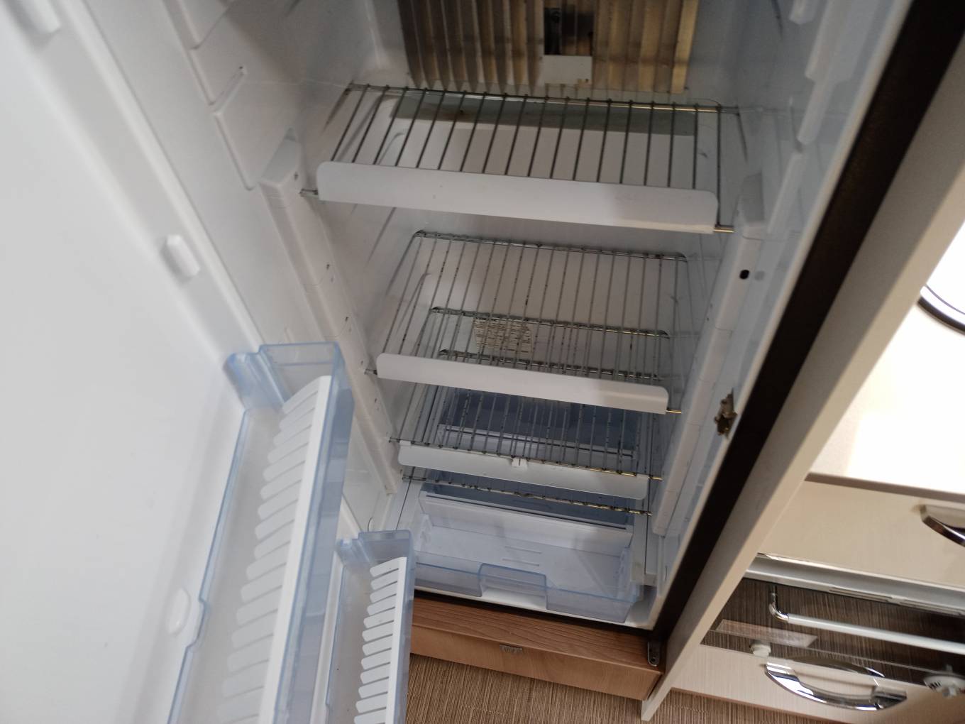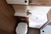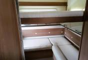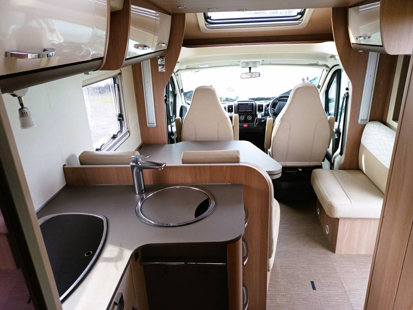 It is space efficient, too in that it has 2 electric drop-down beds to the front and rear. With air blown central heating and hot water, on electric and gas, refillable LPG, and a well equipped kitchen and wash room, the former with a tall and capacious fridge-freezer.