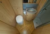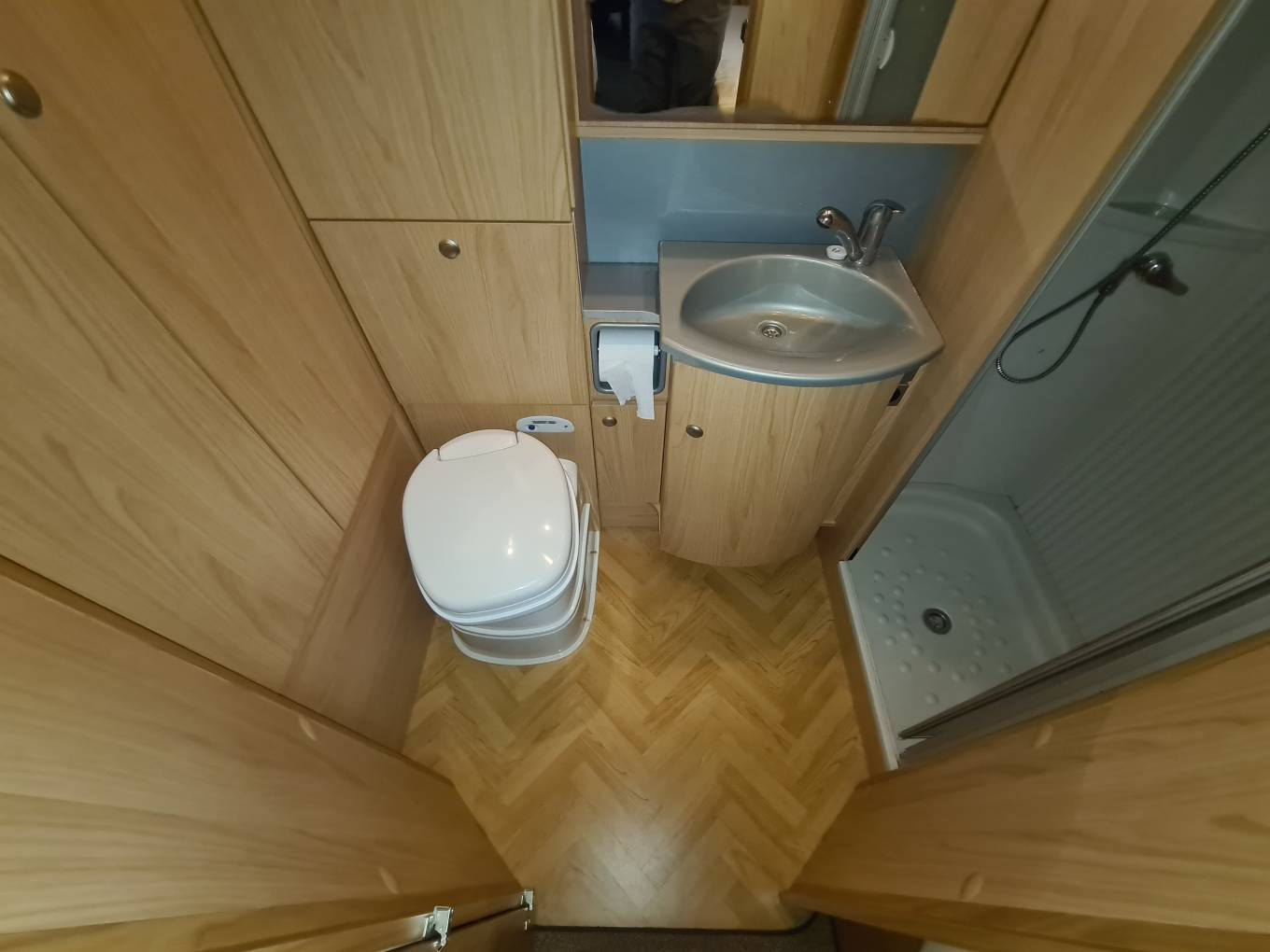 There's a central kitchen which is well designed with a sink, 3 burner gas hob with extractor fan above and opposite is a combination oven/grill on top of 3 way large fridge with separate freezer. Storage is not a problem with plenty of lockers to hold all of the essentials.