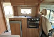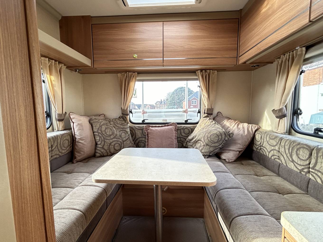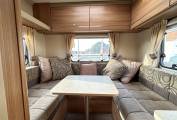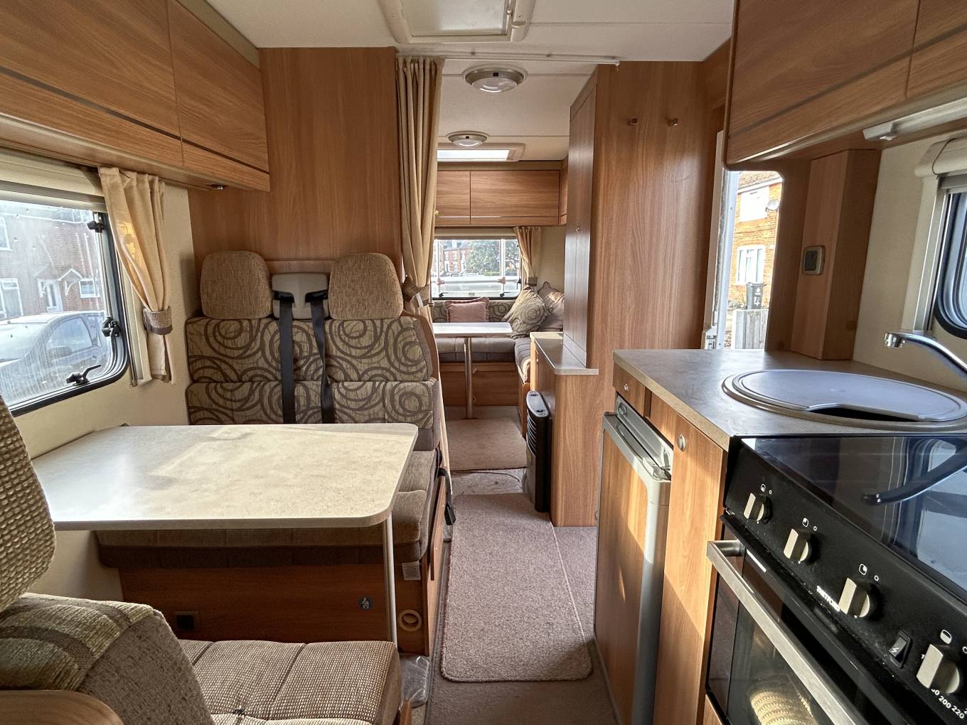 The mid-kitchen is well equipped and comes with a gas oven and grill, a 3 gas burner hob, a sink and mixer tap, a 3 way fridge and plenty of cupboard and drawer space for your kitchen essentials. Opposite the kitchen is the second lounge dinette. There is a dining table which fixes onto a side rail and this can be removed to create more space. There are forward and rear facing 2 seater sofas both of which are fitted with 2 seat belts each. This area also converts into a double bed.