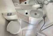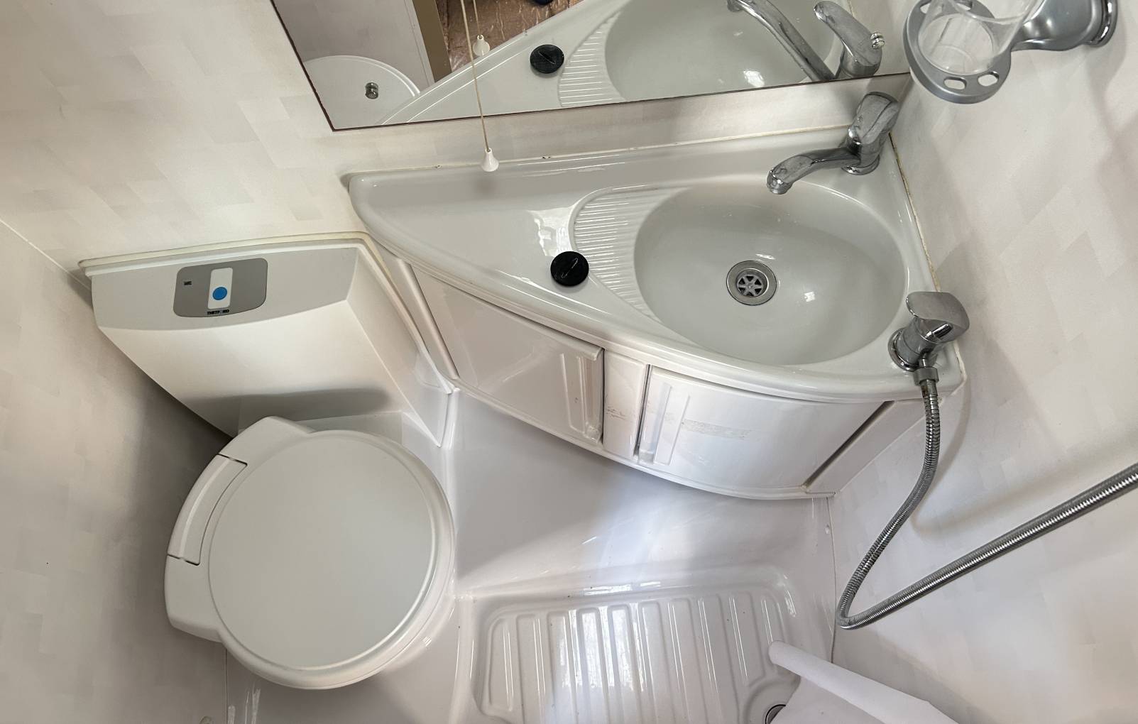 The washroom has everything you need to keep yourself fresh on your travels. There is a shower, a Thetford cassette toilet with electric flush, a wash basin with a mixer tap and a large mirror.
