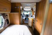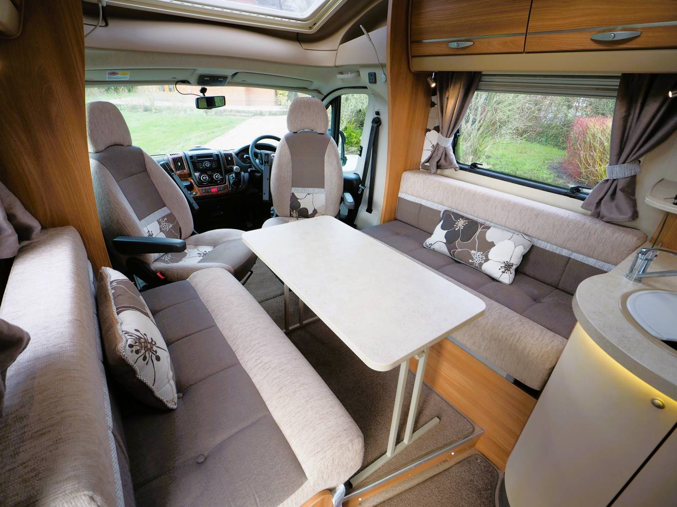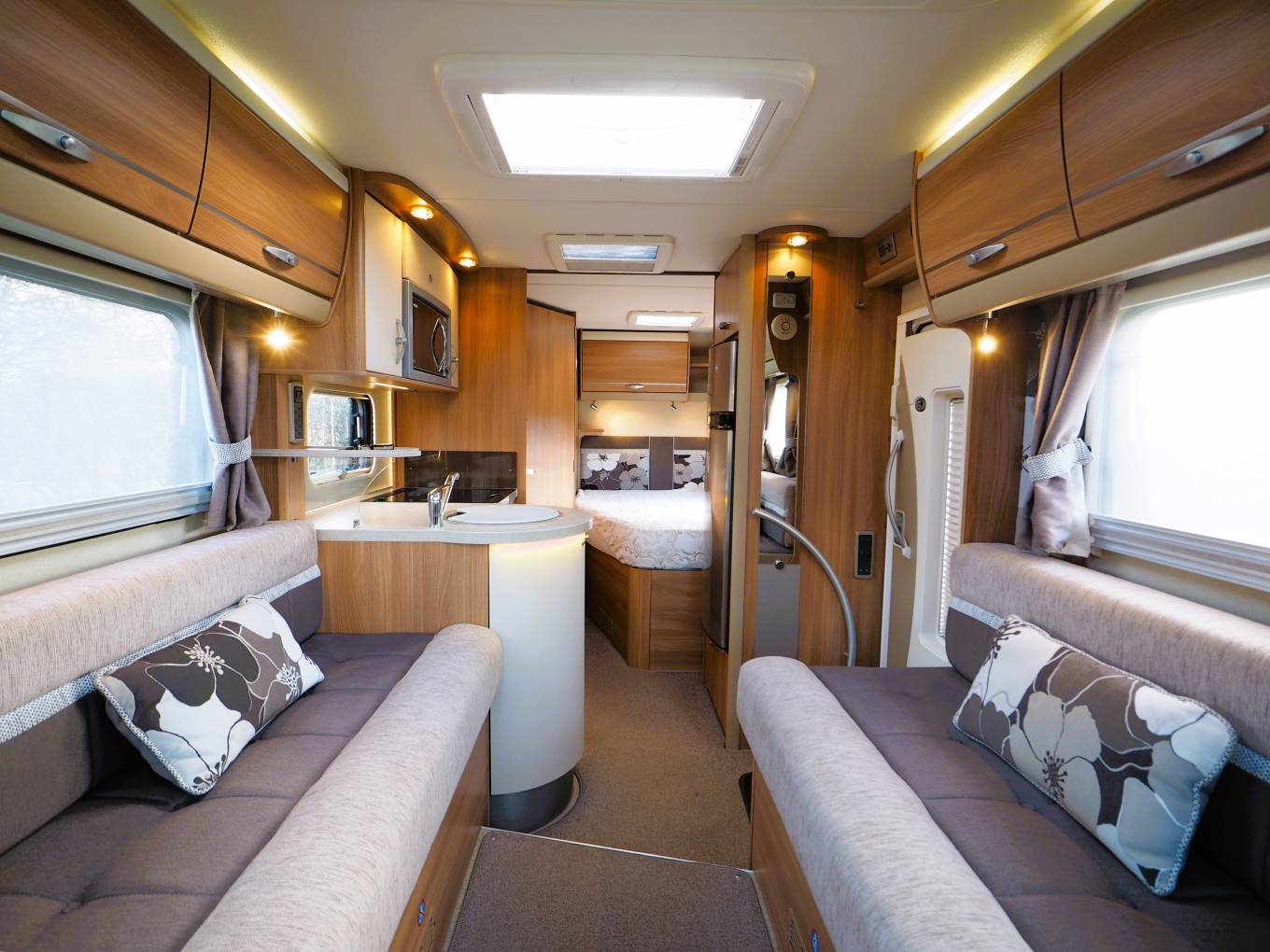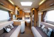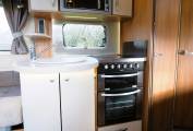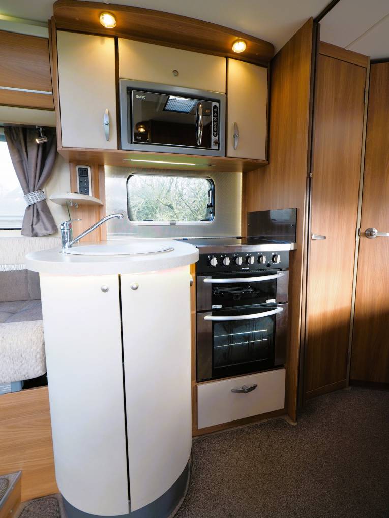Centrally the Kitchen area will satisfy even the most keen of cooks with all you need to rustle up anything from a simple snack to a full blown Sunday Roast. A dual fuel hob with 3 gas burners and an electric hot plate sit above the separate oven and grill. To the side is a good sized sink with hot and cold running water and a microwave oven is set into the cabinets above. An under counter cupboard with rotating storage shelves as well as overhead locker space provides all your storage needs. A large 3-way fridge with separate freezer is located opposite and there is further storage space above and below. To the side of the fridge is the dedicated storage cupboard for the occassional dining table.