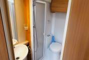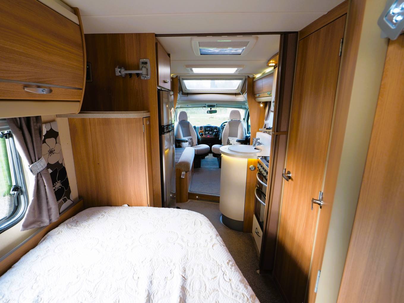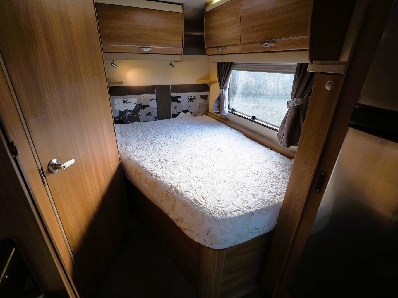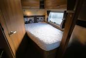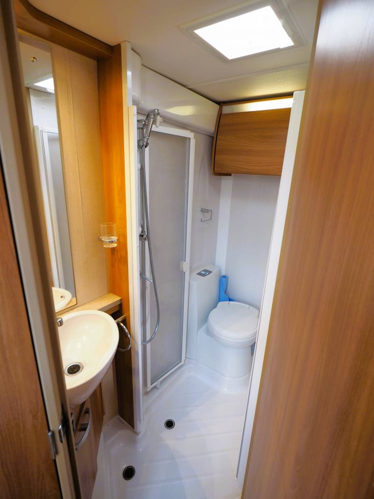 There is a rear fixed French bed with overhead storage lockers to two sides, personal courtesy lights and a TV point with adjustable arm. Natural light from the overhead skylight and large side window both fitted with flyscreen and blind. The bed lifts on gass assisted struts to reveal a huge storage area which is also accessible from the outside via the external locker door. To the side is a fully fitted washroom providing true home from home comfort with a flushing cassette toilet, sink and vanity with storage and a separate shower with overhead ventilation.