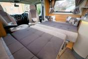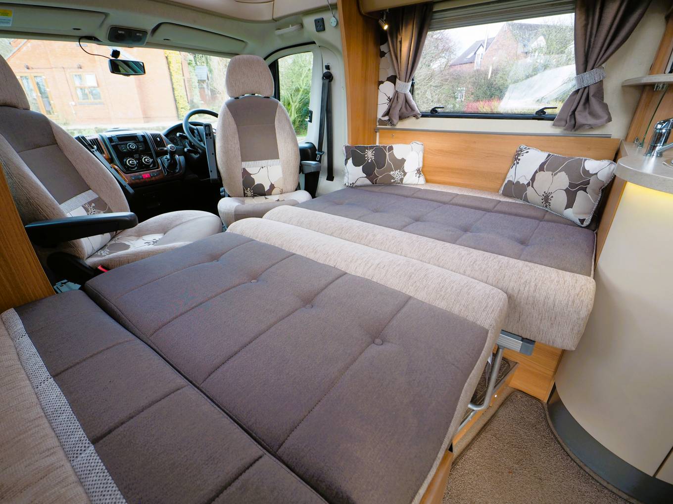 The lounge area is made up with two, good sized and comfortable, side sofas and of course the swivelling front driver and passenger captains chairs provide additional seating options and capacity. Plenty of space for 5 or 6 people to sit around the pop up table to dine or for entertaining. A lovely space to stretch out and relax with plenty of natural light from the side windows and overhead skylight, all fitted with blinds and flyscreens. The sofas provide further storage underneath to compliment the overhead lockers to both sides. Come night fall, the sofas also swiftly convert to provide a second double bed area if required.
