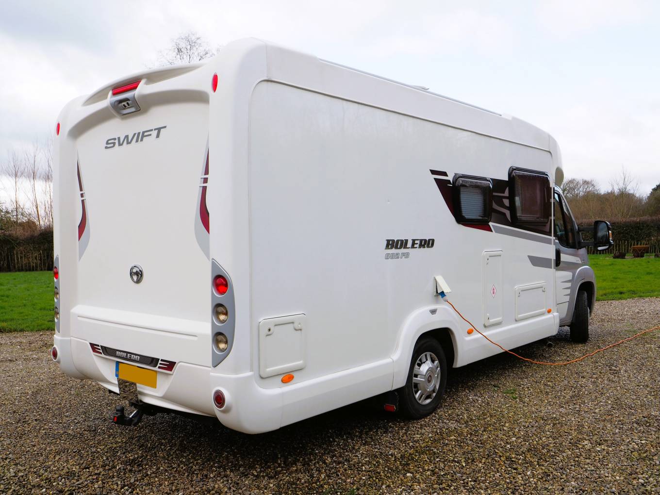 The Swift Bolero is a premium offer from the Swift stable of motorhomes and comes with a high specification. This 4 berth/2 travel belt model is based on the popular and proven Fiat Ducato with the 2287cc MultiJet Diesel engine delivering 130bhp through a six speed manual transmission. Up front there is plenty of driver and passenger comfort with the swivelling captains chairs, cab air con, cruise control, electric front windows and reversing camera/mirror.