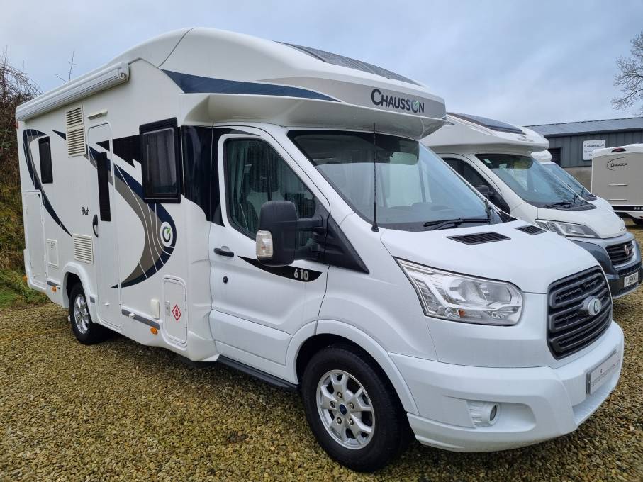 2017 Chausson 610 Flash 4 berth low profile motorhome for sale. Presented in nice condition with low mileage and a high specification, this compact layout is easy to park and manoeuvre but offers excellent use of space inside. The maxi lounge area can seat 6 persons easily with an adjustable table which can fold in half for ease of access. This model features a drop down bed which can be used in either the upper position offering 4 berths, or in a lower position for 2. The rear washroom is spacious with separate shower and has a large cupboard for storage. The 610 model also has a large rear garage area with multiple access doors, handy for more bulky items. Other features include Ford 3500kg chassis with colour coded cab, front fog lamps, alloy wheels, reverse camera, awning, solar panel, TV, cab air con and cruise control. Sale includes mechanical service, gas certification, full MOT and 12 months warranty. Finance and part exchange available. Please call for further details.