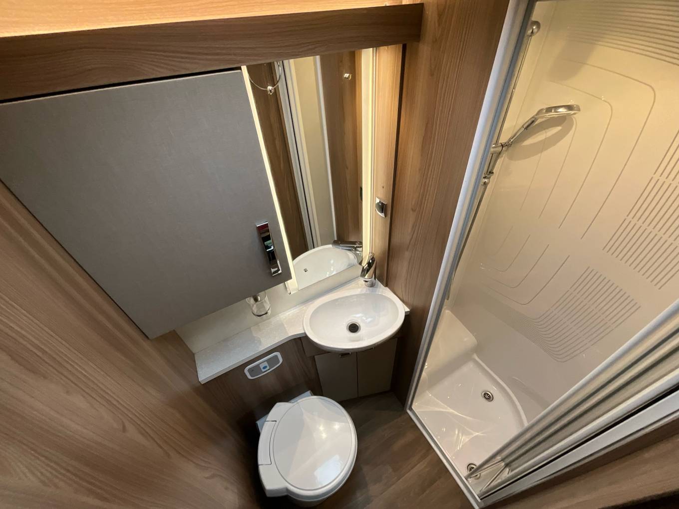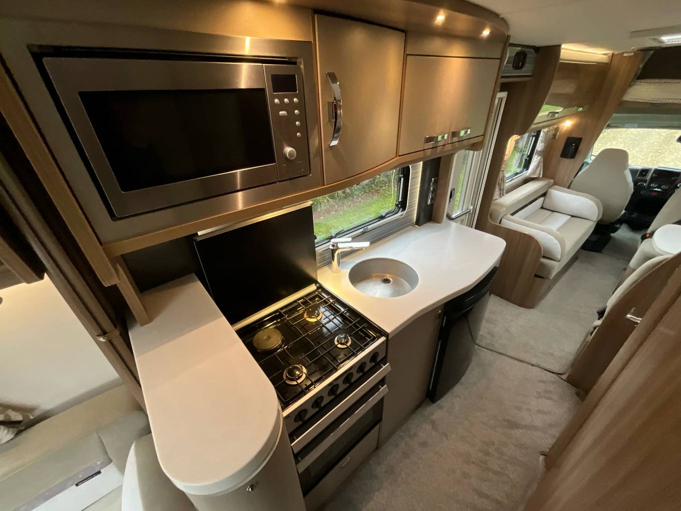From the rear of the vehicle, there is a large rear seating area that can also be converted to a double bed when needed. Moving into the middle of the vehicle, we have a generous, washroom with cassette toilet, hand basin and separate shower cubicle. Opposite to the washroom is a well equipped kitchen with oven, grill, three gas burners, one electric hob, microwave, sink and a good size fridge with removable icebox.