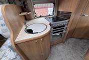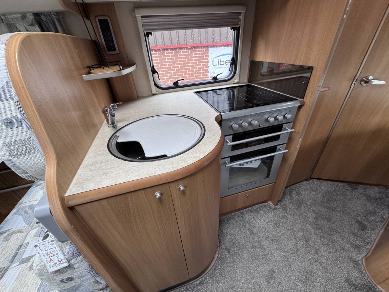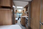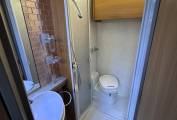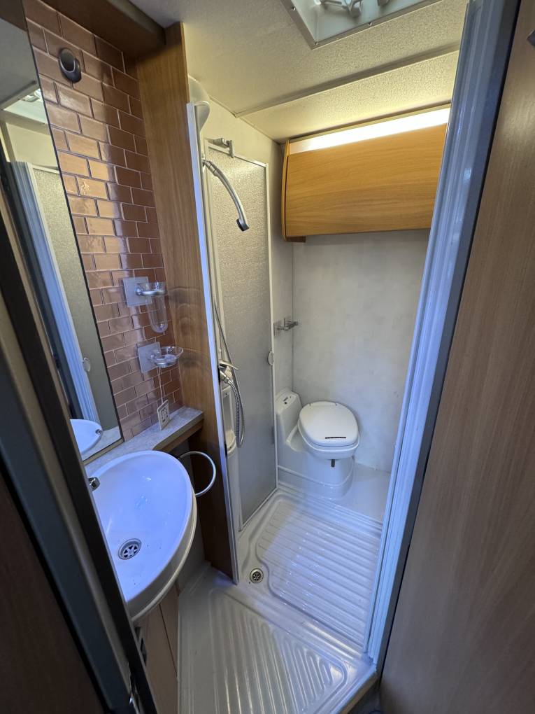 To the rear of the kitchen in the washroom there is a large shower, cassette toilet and wash basin. There is also a number of storage options for toiletries.