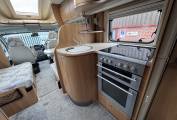Moving towards the rear of the motorhome, you find the kitchen on the offside and the washroom to the rear. The kitchen is large and well equipped with plenty of storage and preparation areas, a large fridge with separate freezer, 3 burner gas hob with electric hot plate, gas oven with separate grill, a microwave and a sink with hot and cold water.