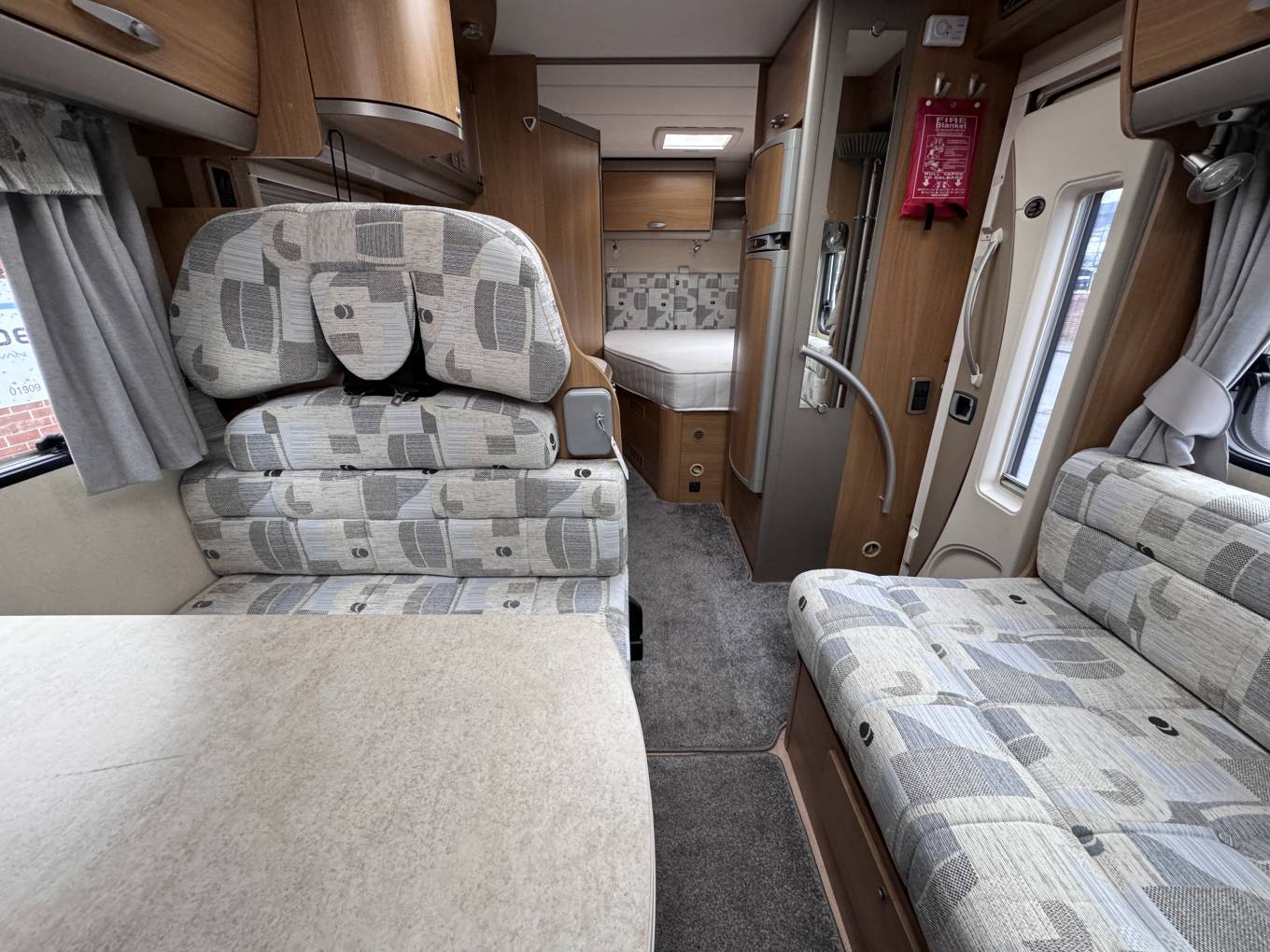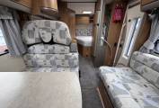 Behind the drivers position you will find a dinette with 2 belted seats and an adjacent sofa along the nearside wall. The 2 cab seats also swivel to make a large sociable area with seating for around 6 people. There is a multitude of storage options in this area both above and below the seats.