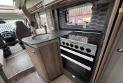 Moving towards the rear of the motorhome, you find the kitchen on the offside and the washroom to the rear. The kitchen is large and well equipped with plenty of storage and preparation areas, a large fridge with separate freezer, 3 burner gas hob with electric hot plate, gas oven with separate grill and a sink with hot and cold water.