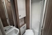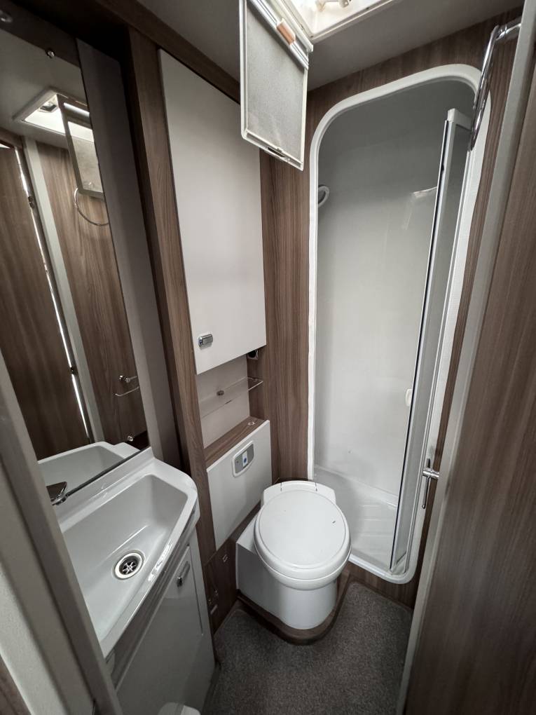 To the rear of the kitchen in the washroom there is a large shower, cassette toilet and wash basin. There is also a number of storage options for toiletries.