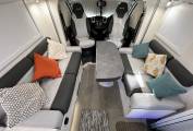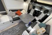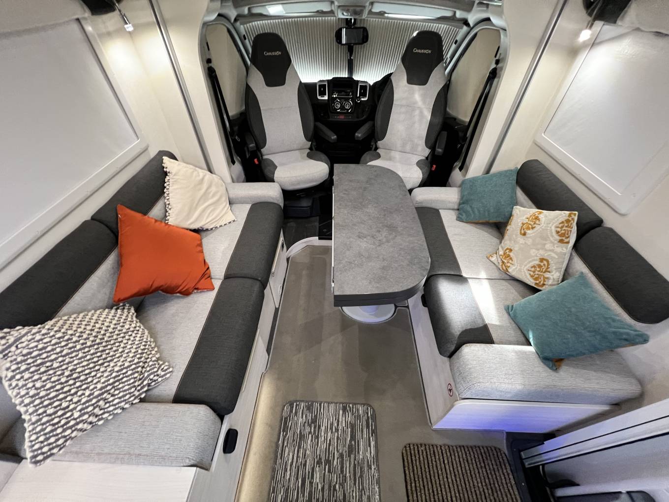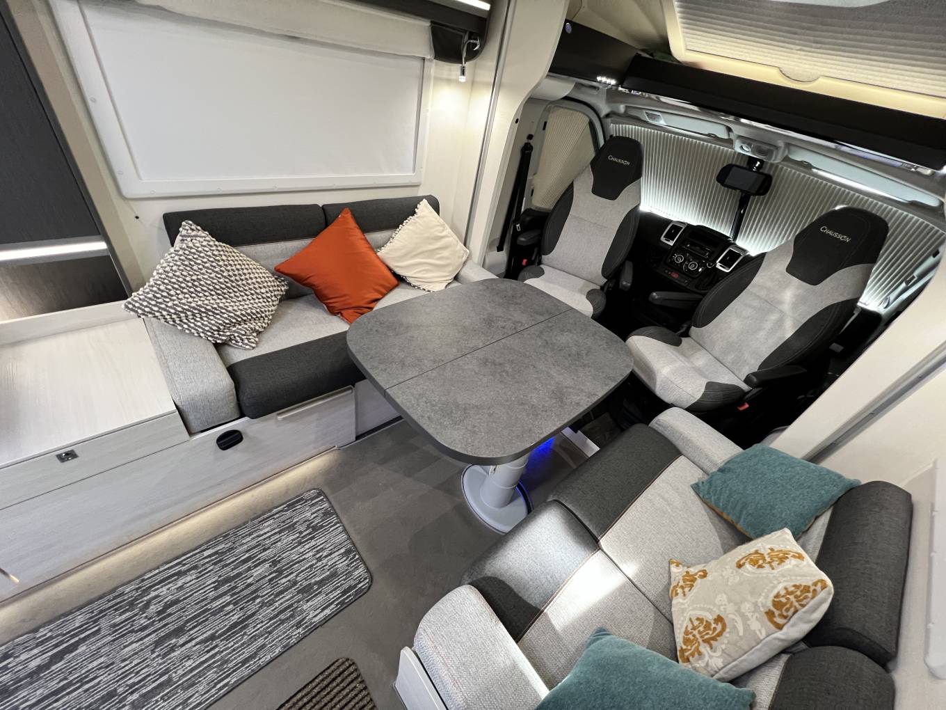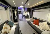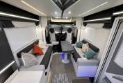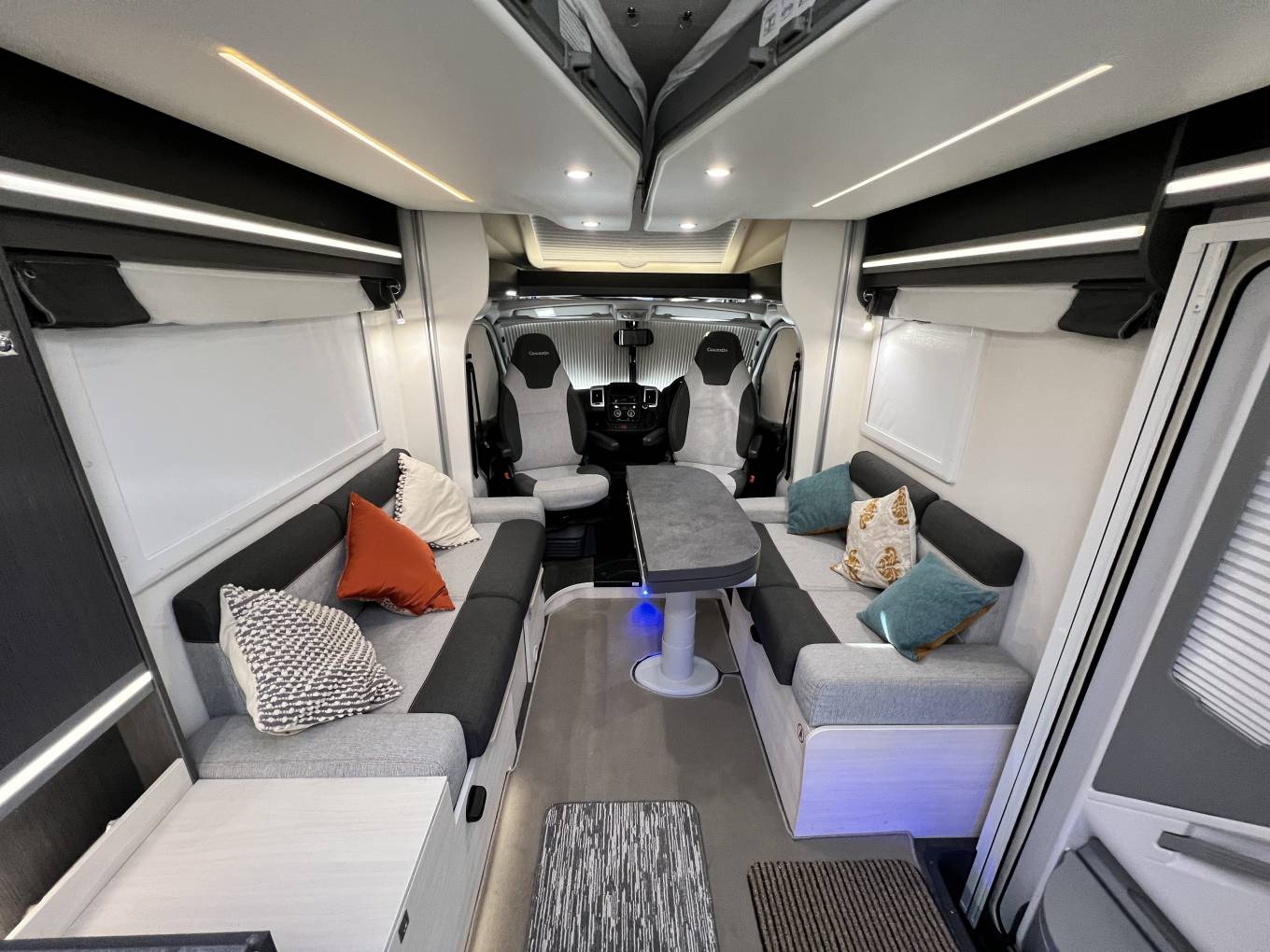 On entering via the flyscreen protected habitation door, to your right is the large lounge area consisting of Two Inward Facing Settees, Swivelling Cab Captains Chairs and a centrally mounted table which folds out for dining.