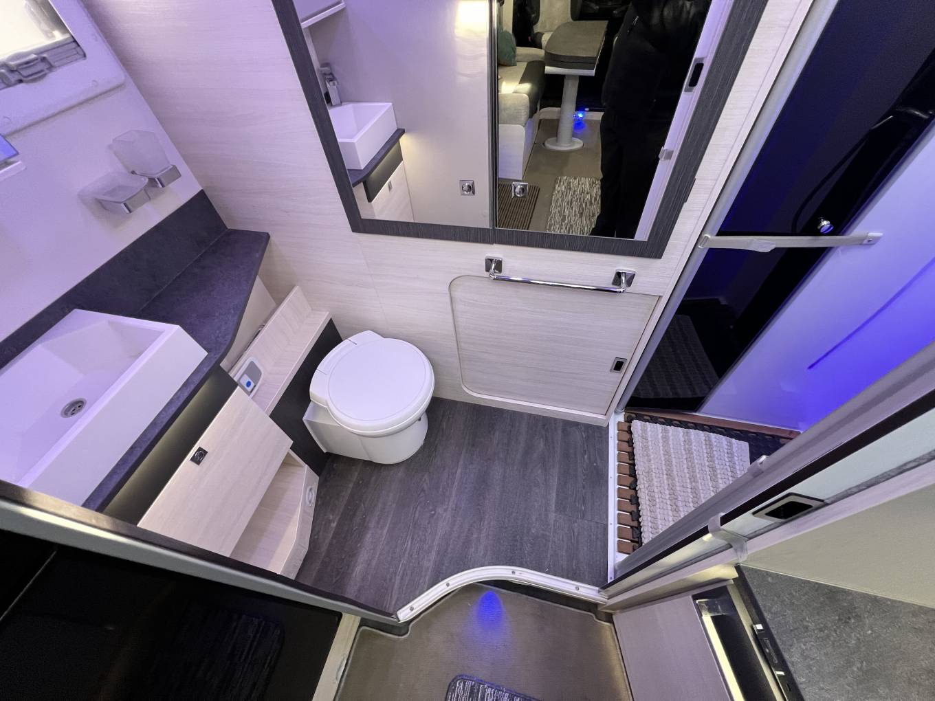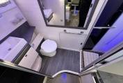 Across the rear is the large bathroom where you will find a Thetford Flush Cassette Toilet, a Wash Handbasin, a large Shower Cubical and one of the biggest wardrobes you will ever see in a motorhome.