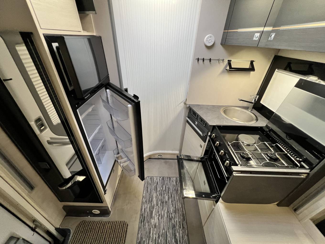 Left as you enter is the is the highly equipped kitchen consisting of a Two Gas Burner and one Electric Hotplate Hob, an Oven Grill combination, a Thetford Fridge with a separate Freezer, a Sink with a Hot and Cold Mixer Tap, plus plenty of cupboards and an extendable worktop.